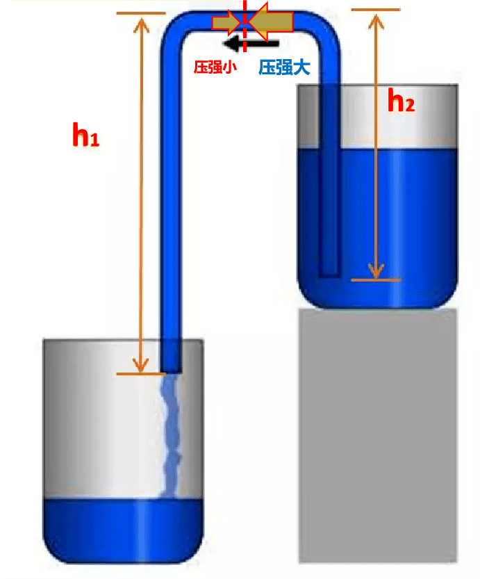虹吸原理本质上利用了“ 压强差 ”,在确定密闭容器当中液体的高度、压强皆相等的情况下,利用一根倒U型的管状结构灌满水,随后插入处在较高位置的容器当中,再将下段的开口对准下方的容器。