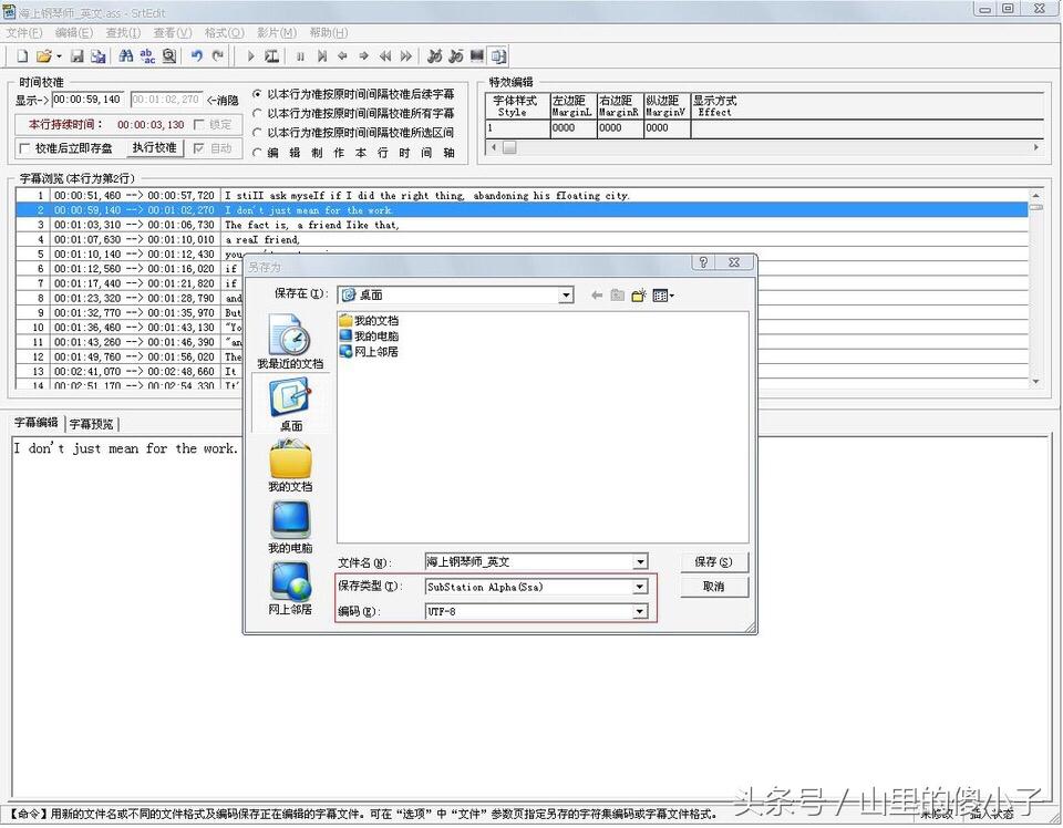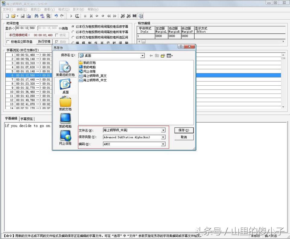 用SrtEdit载入英文字幕(中文字幕也一样),然后另存,记得我保存的格式吗,否则有些特效显示不出来。