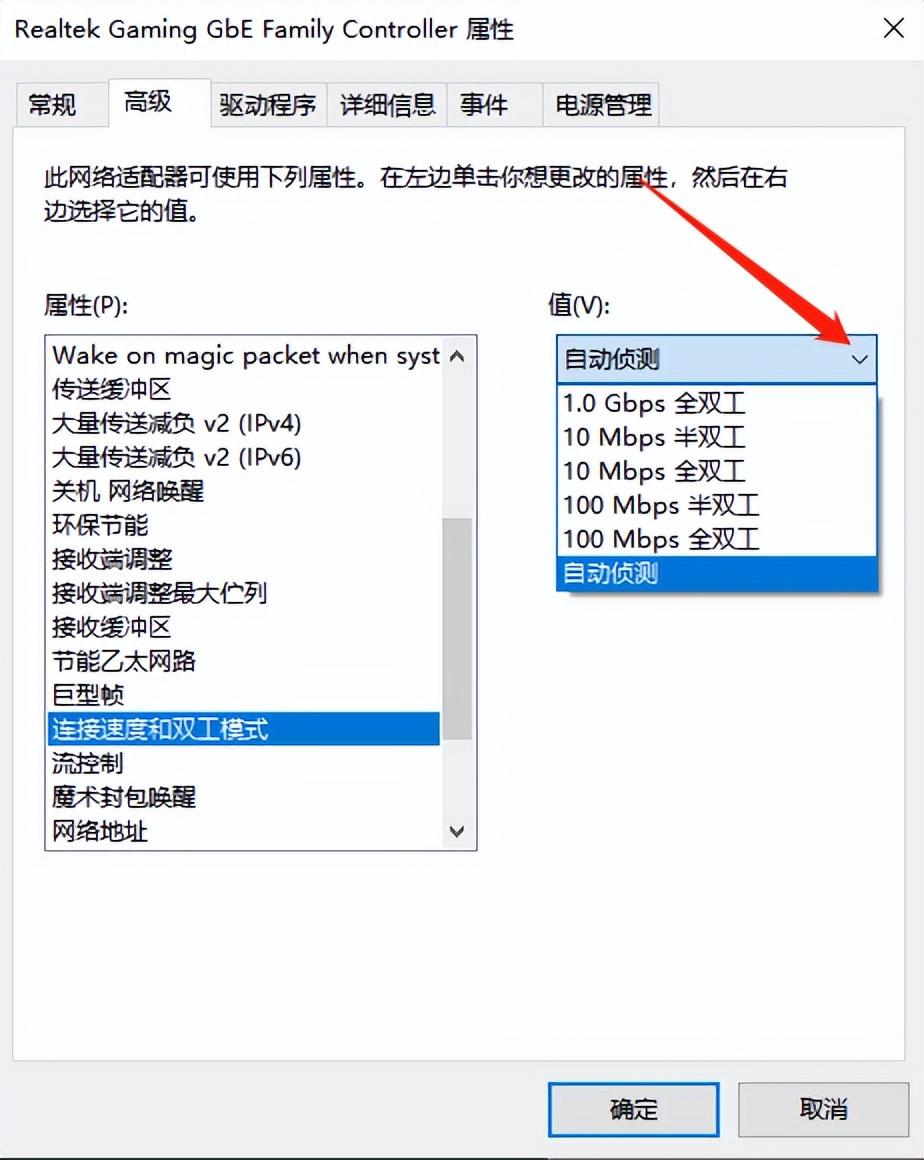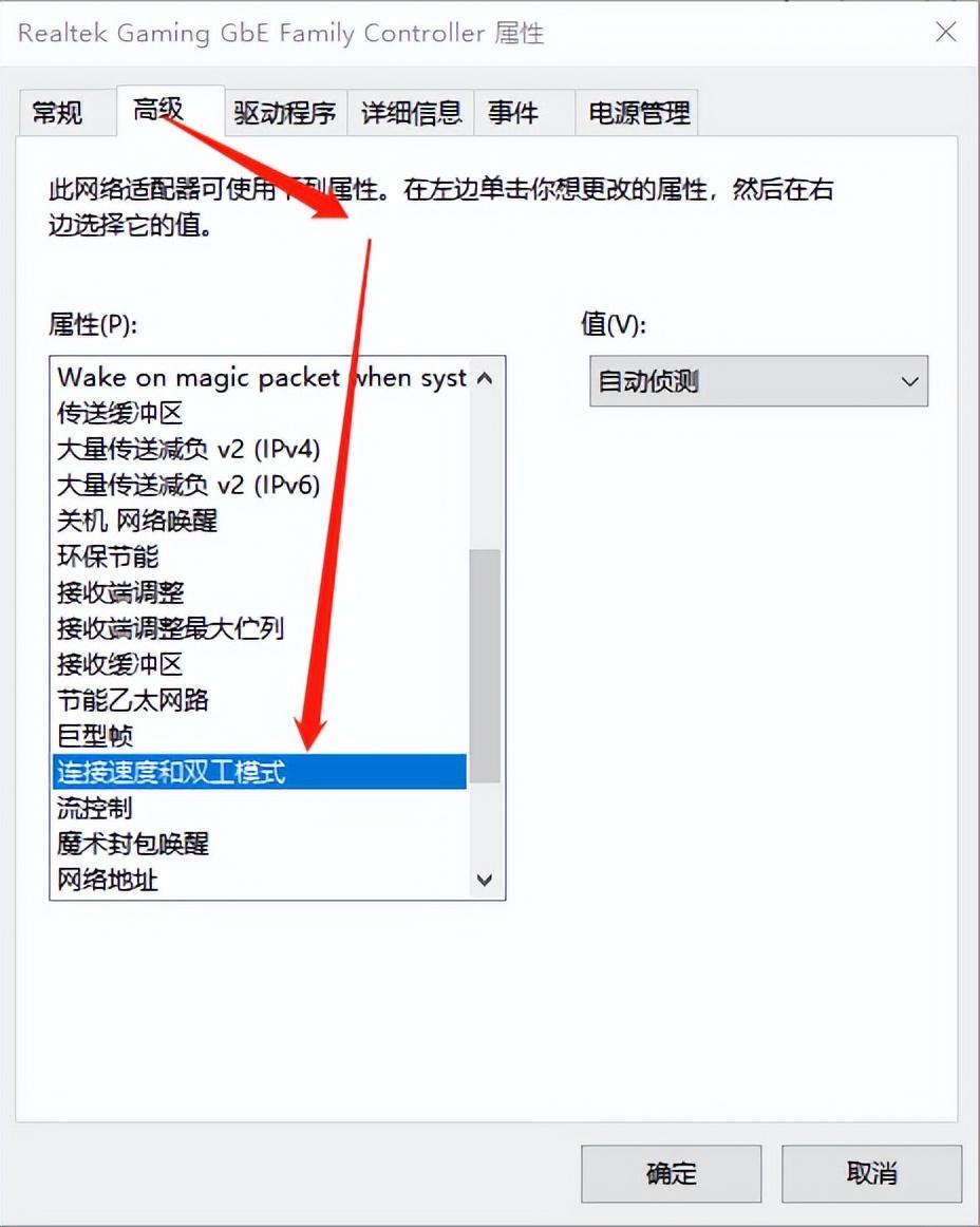 五、切换到“高级选项卡”找到“连接速度和双工模式”