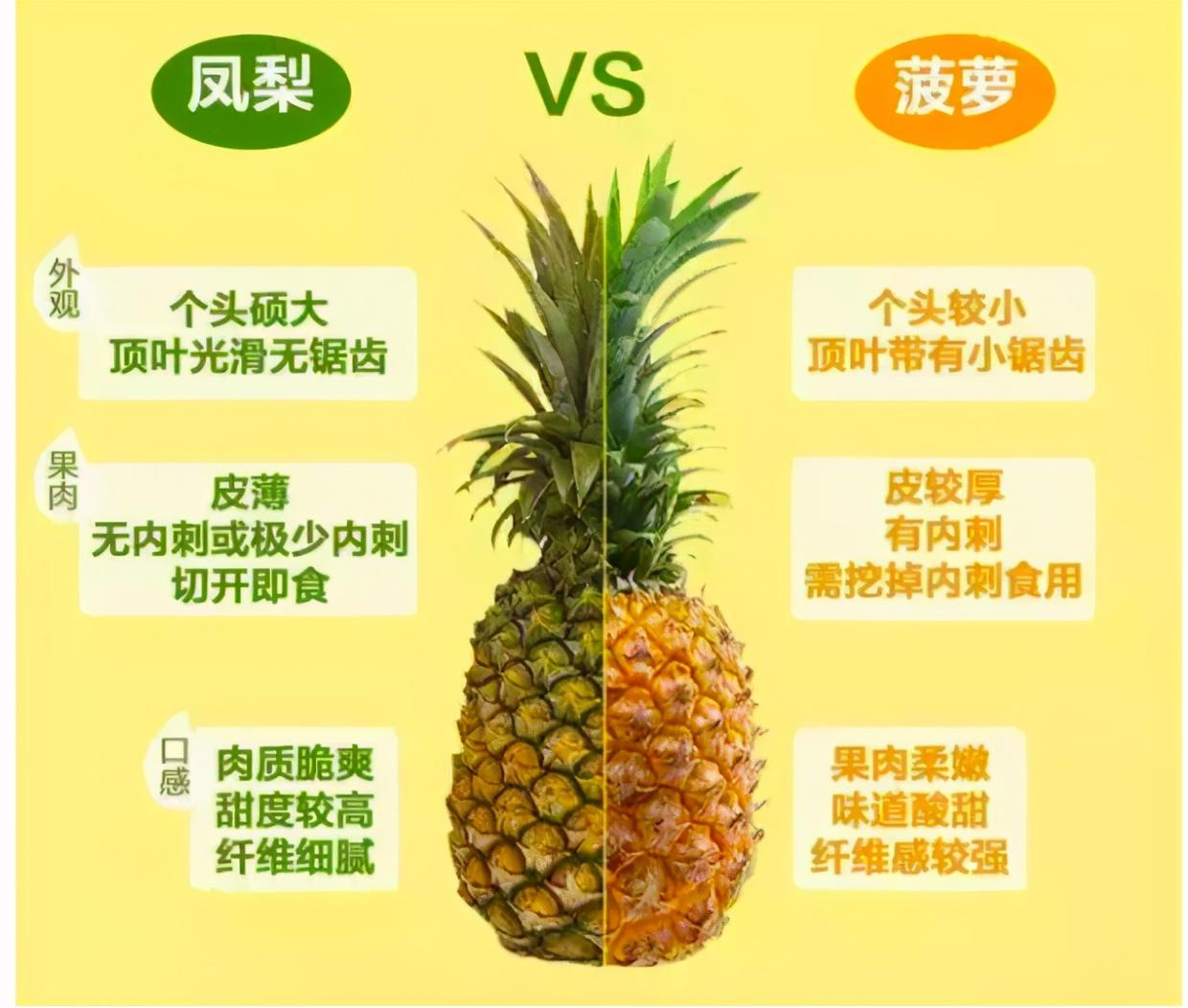 事实上,从生物角度而言菠萝和凤梨 是同一种水果 , 只是叫法不同而已, 但从日常生活出发, 我国台湾人民在菠萝引入之后将其进行培育,生产出了一个新的品种,这一新品种的表皮比较薄,果眼浅所以被叫做无眼菠萝,这也成为了生活中遇到的凤梨,即金钻凤梨。所以大家在购买菠萝或凤梨的时候要留意果眼的深浅,不同品种的菠萝口感也有所差异哦!