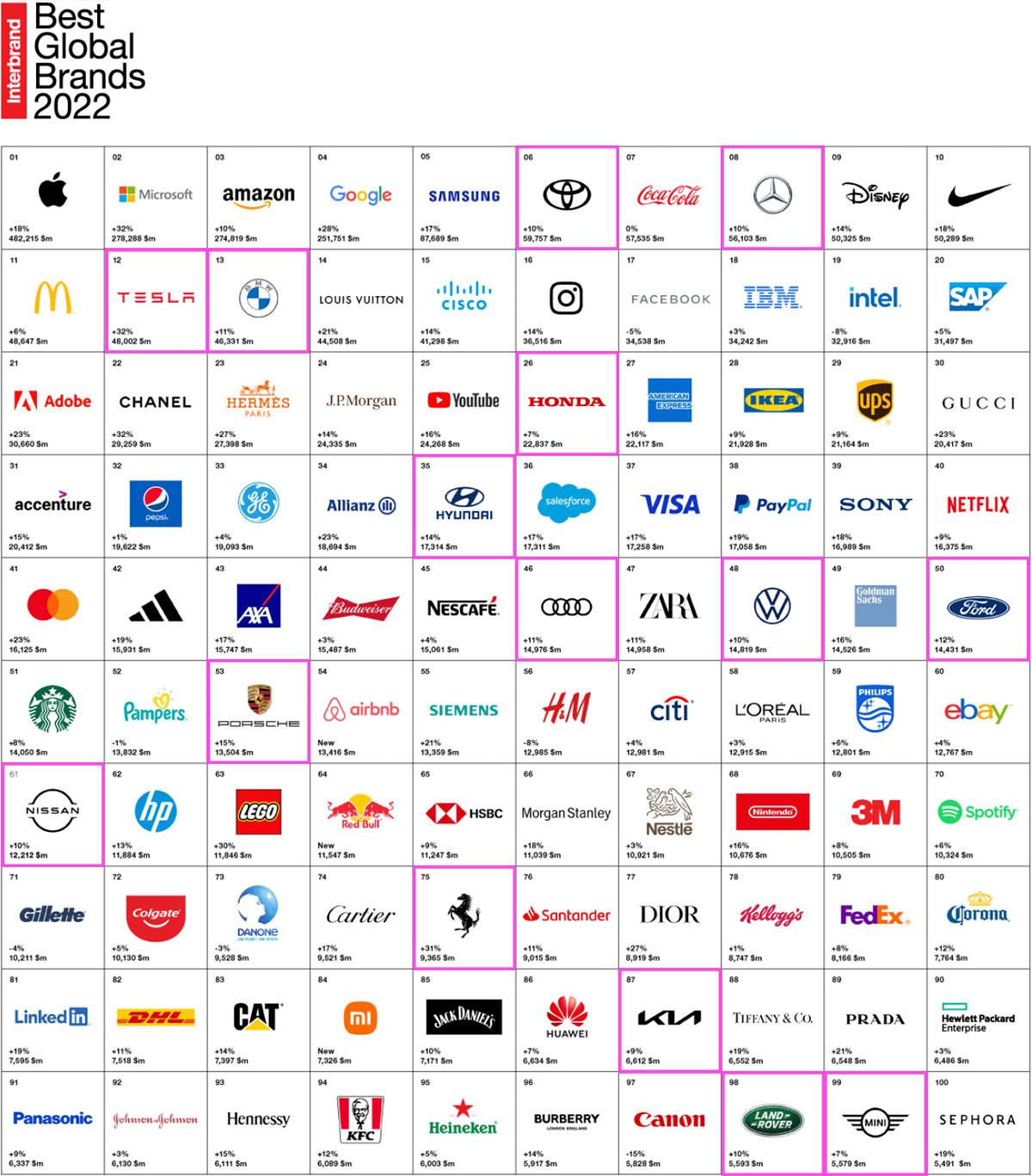 近日,全球品牌咨询集团Interbrand公布了2022年最佳全球品牌排名, 该榜单根据全球各大公司的品牌价值进行排序。 上榜的品牌共100家。包括全球所有品牌,不仅是汽车品牌。