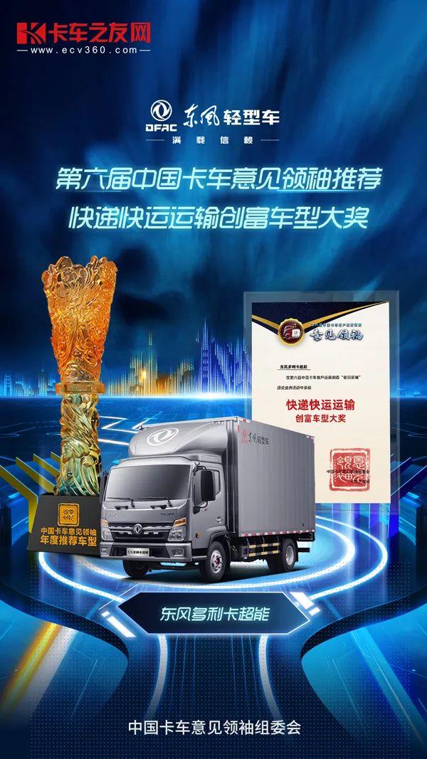 伴随蓝牌新规落地执行,合规轻卡成为市场主导,其中东风多利卡超能一经推出便引起主流媒体与用户的广泛关注。2023年1月10日在由《卡车之友网》主办的“第六届中国卡车客户运营调查——意见领袖颁奖盛典”活动上,东风多利卡超能荣获由中国卡车意见领袖推荐评选的“快递快运运输创富车型大奖”。