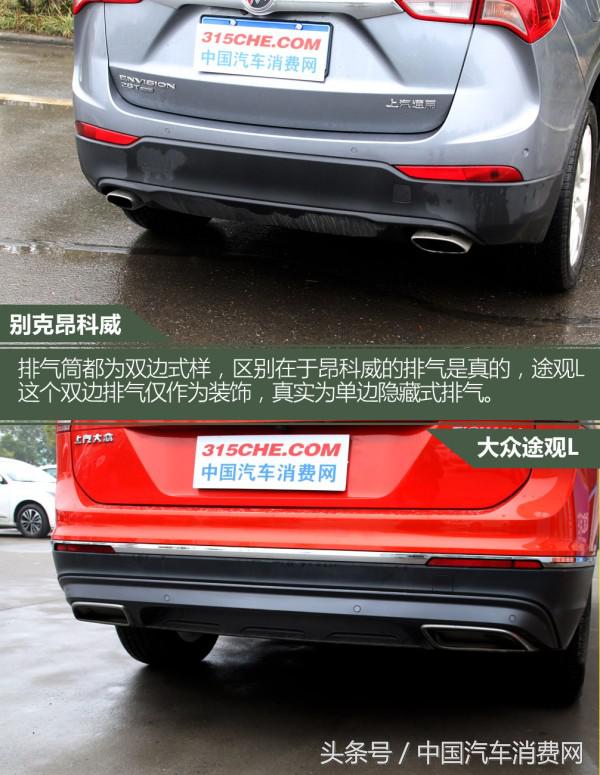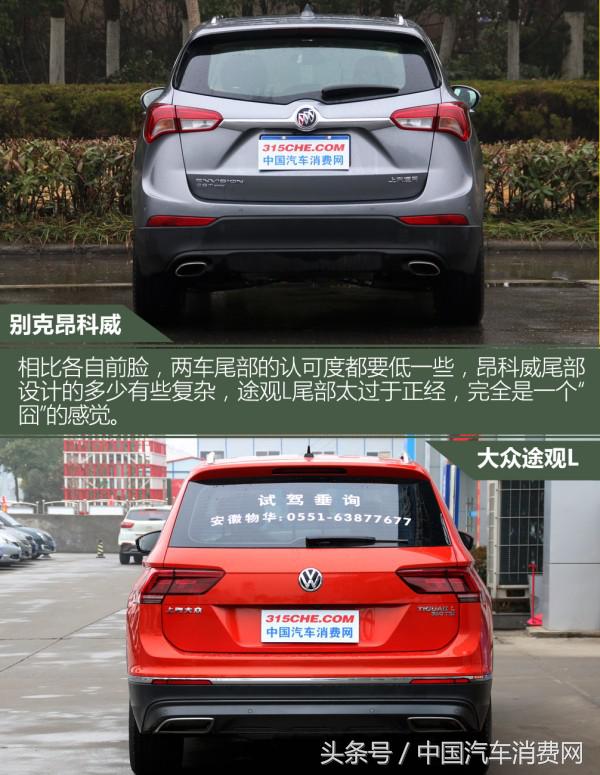 相比各自前脸,两车尾部的认可度都要低一些。昂科威尾部设计的多少有些复杂,途观L尾部太过于正经,完全是一个“囧”字的感觉。两车尾部都使用了双边排气,昂科威这个排气是真的,途观L排气仅是装饰。安全配置上,昂科威带有10颗雷达探头(前6后4),途观L配有12颗(前6后6),此外,两车多数车型上都有倒车影像功能。