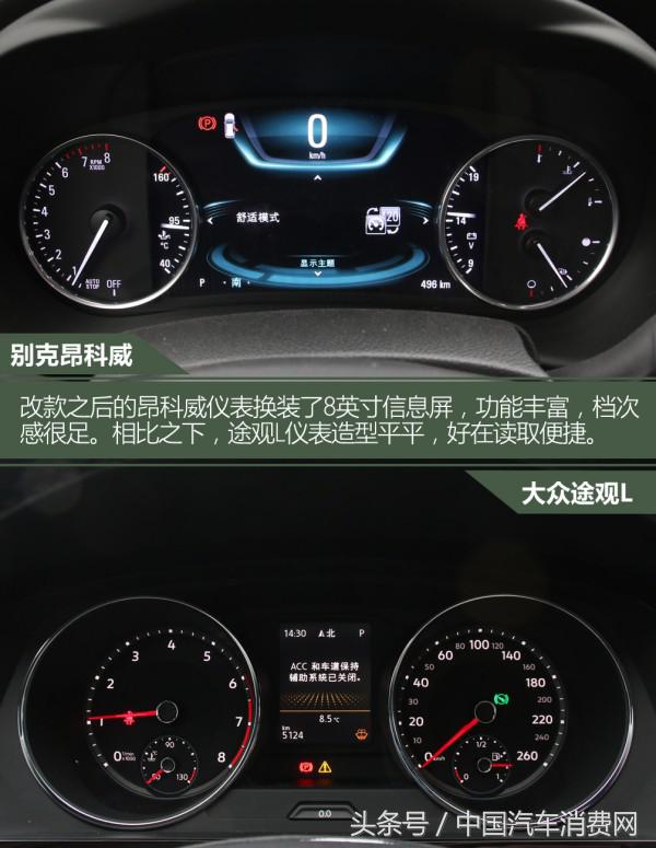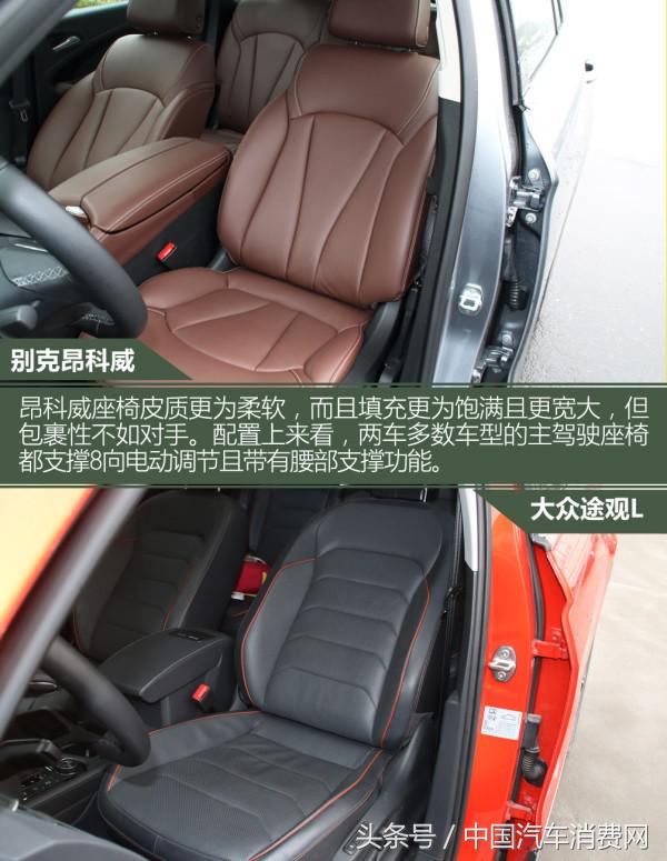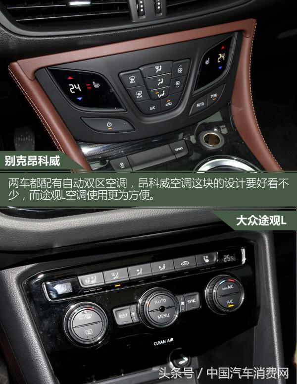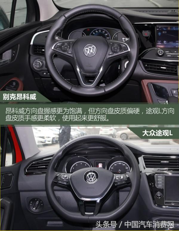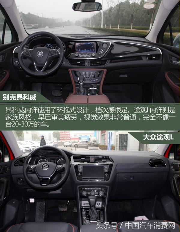 尽管昂科威相比途观L先来到国内市场,但其内饰不论设计还是用料,完全碾压途观L。昂科威的内饰豪华感在这个级别一直是数一数二的。而途观L内饰家族风格显著,档次感平平,完全不像一台20-30万车应有的表现。两车中控上方都使用了软性材质,昂科威使用了缝线营造出皮质效果,并且细节之处辅以桃木装饰以及真皮包裹,用料以及整体视觉效果比途观L好太多。