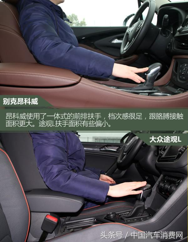 身高170cm的体验者在昂科威前排,得到1拳2指的头部空间,对手途观L为1拳1指,差别不大。昂科威使用了一体式的前排扶手,档次感很足,跟胳膊接触面积更大。途观L扶手面积有些偏小。