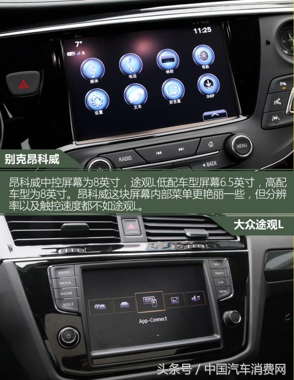 昂科威中控屏幕为8英寸,途观L低配车型屏幕6.5英寸,高配车型为8英寸。昂科威这块屏幕内部菜单更艳丽一些,但分辨率以及触控速度都不如途观L。配置方面,除了常用功能外,两车都配有CarPlay功能,昂科威还带有安吉星。