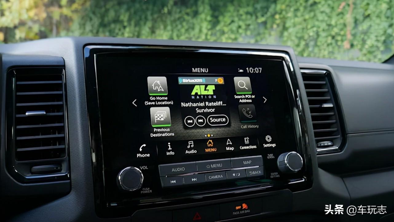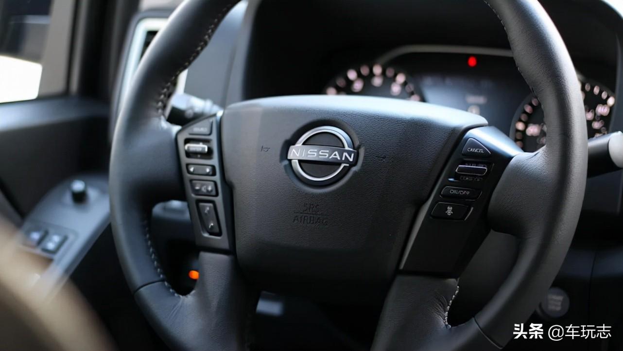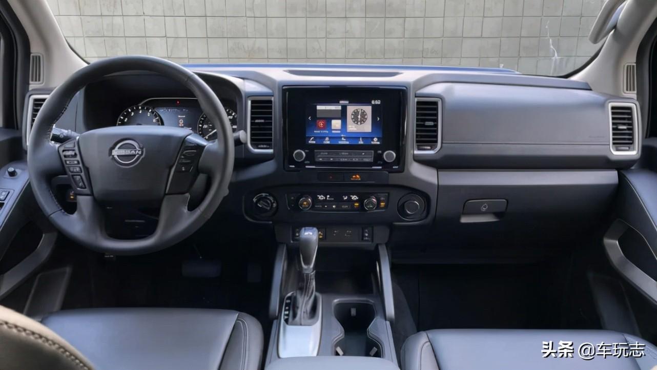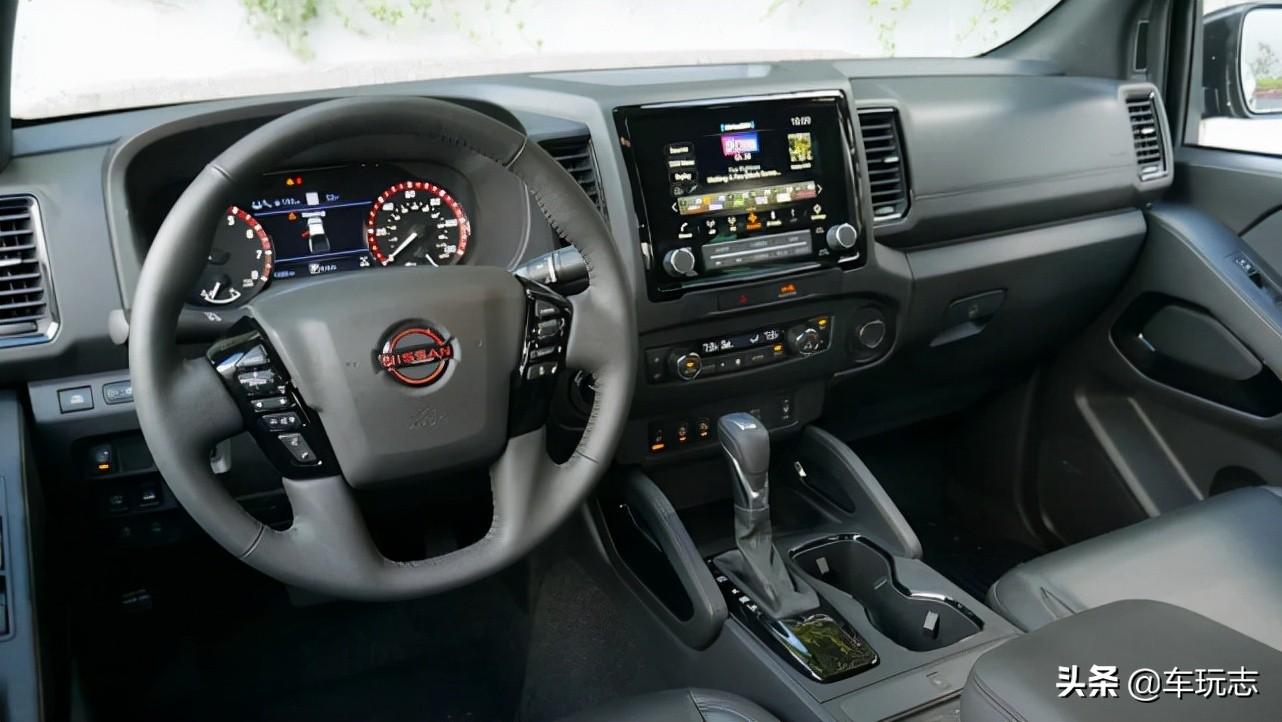 第一印象很好,但不是很好。中控台布局合理,并以非常卡车般的方式装载了咔嗒咔嗒的按钮、旋钮和开关。唯一的触摸表面是触摸屏本身,它是一个 8 英寸的单元 — PRO-4X 的图片中出现了一个带有闪亮黑色边框的 9 英寸触摸屏。一个长的、传统的变速杆伸出地板,并以足够大的力量移动,适合卡车。仪表很大且易于阅读,尽管日产仪表之间的中央屏幕已经过时且凌乱。我们可以对方向盘说同样的话。这是日产的最后一代轮子,这意味着它上的按钮对我们的手指来说很烦人,而且轮子本身并不是特别吸引人。