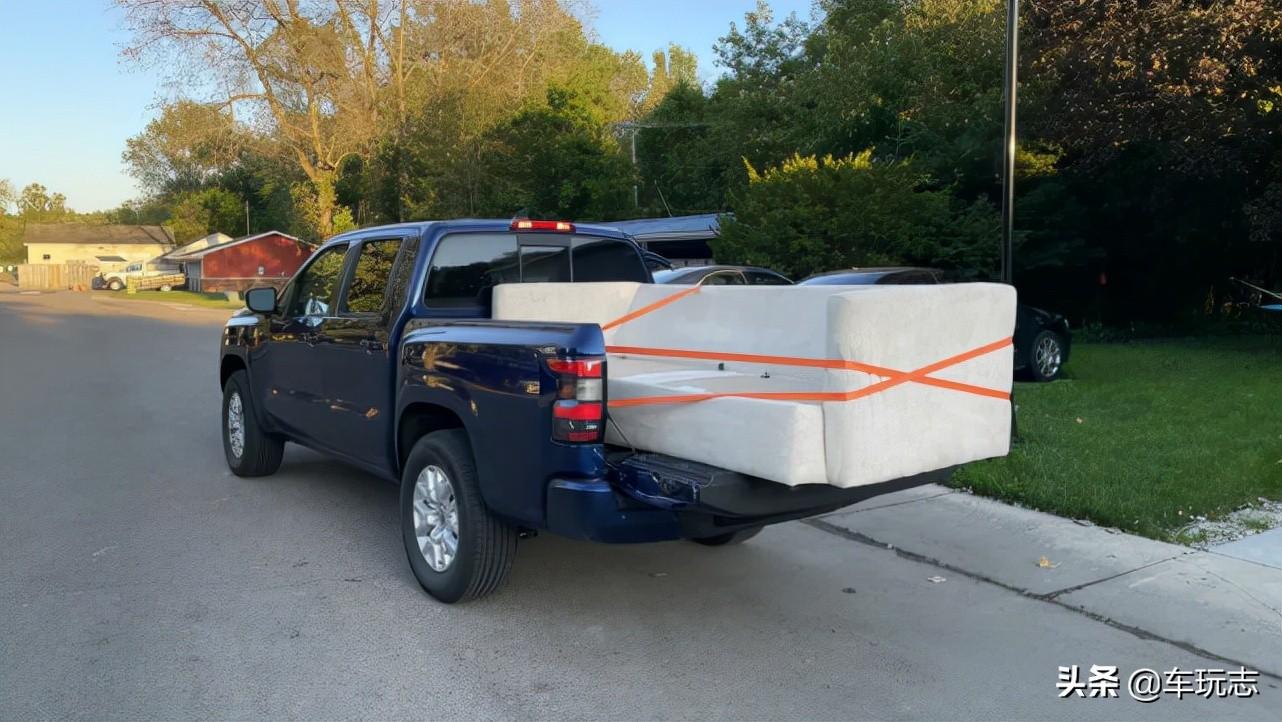 再往后座后面走,我们就到了床边。我们的大床测试包括移动一张比 Frontier Crew Cab 的 59.5 英寸(约 5 英尺)短床长得多的沙发。即使将后挡板放平,需要移动的巨大沙发也伸出了另一英尺左右。