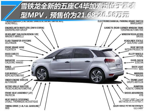 进口到国内的全新五座C4毕加索车身尺寸为4428x1826x1629mm,轴距2785mm,动力方面将配备1.6THP涡轮增压汽油发动机,最大功率121kW/6000rpm,最大扭矩240N•m/1400rpm,匹配6挡手自一体变速箱。零部件部分,这款1.6T发动机的涡轮增压器来自美国老牌企业霍尼韦尔(Honeywell),发动机正时链条来自德国iwis,消声器来自德国Eberspächer,散热器来自日本康奈可(Calsonic Kansei),发动机舱线缆来自美国天合(TRW Fasteners),引擎盖电缆来自西班牙公司Ficosa。废气再循环模块来自德国科尔本施密特-皮尔博格(Kolbenschmidt Pierburg,简称KSPG)。