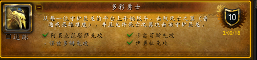 【多彩勇士】: 从每一位守护巨龙的平台上开始战斗,并击败死亡之翼(普通或英雄难度)。