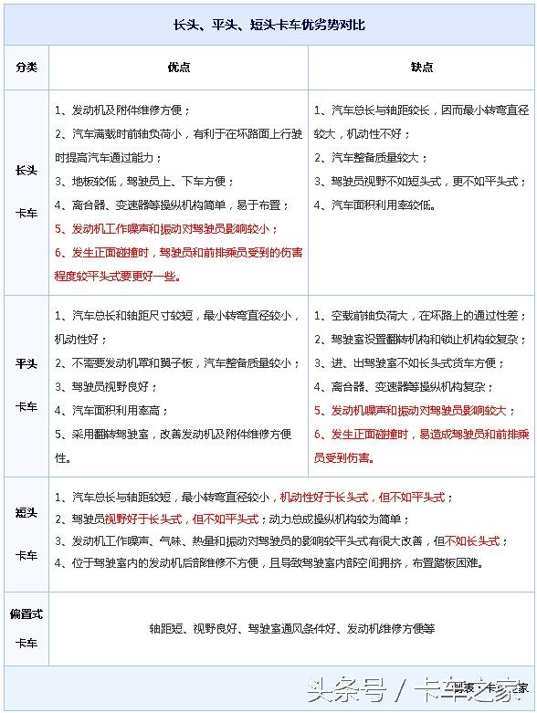 综合来看,长头卡车、平头卡车、短头卡车以及偏置式卡车都是各有优劣,具体对比如下表所示: