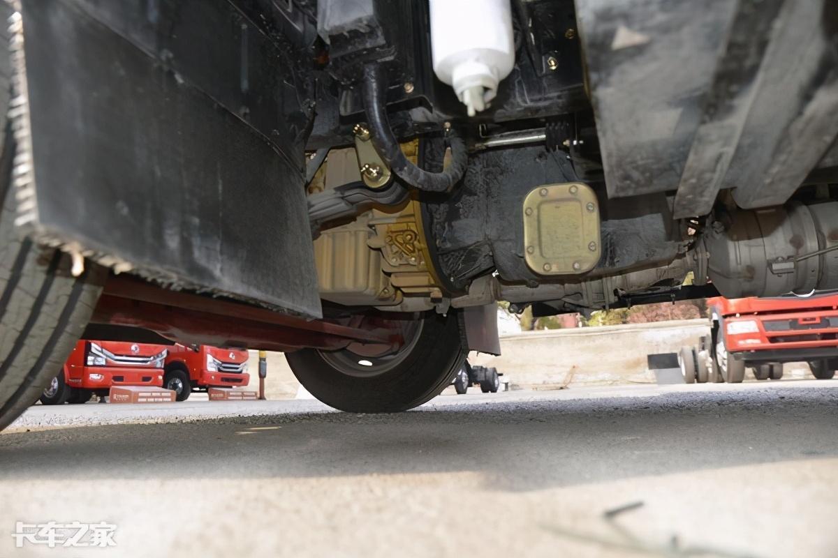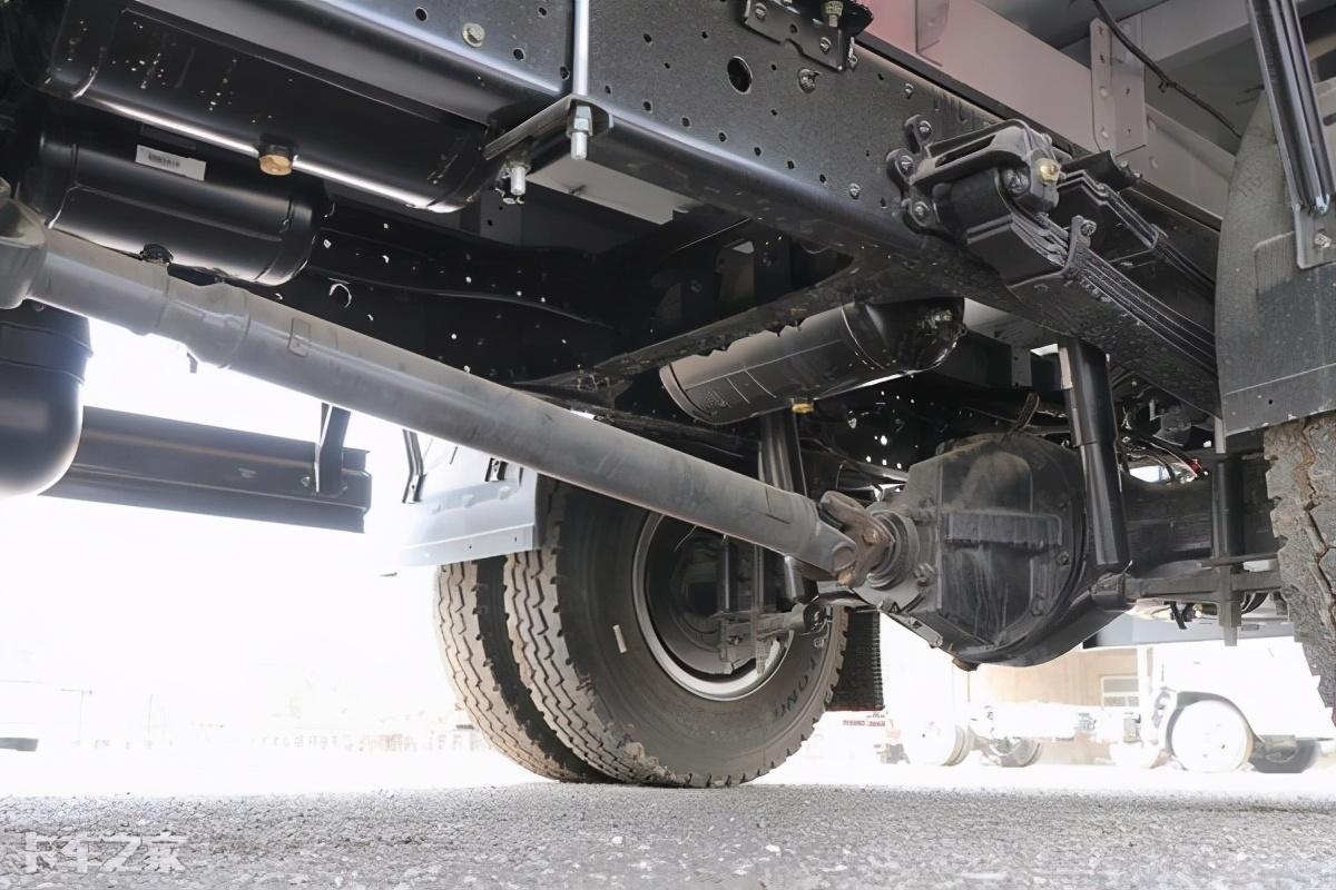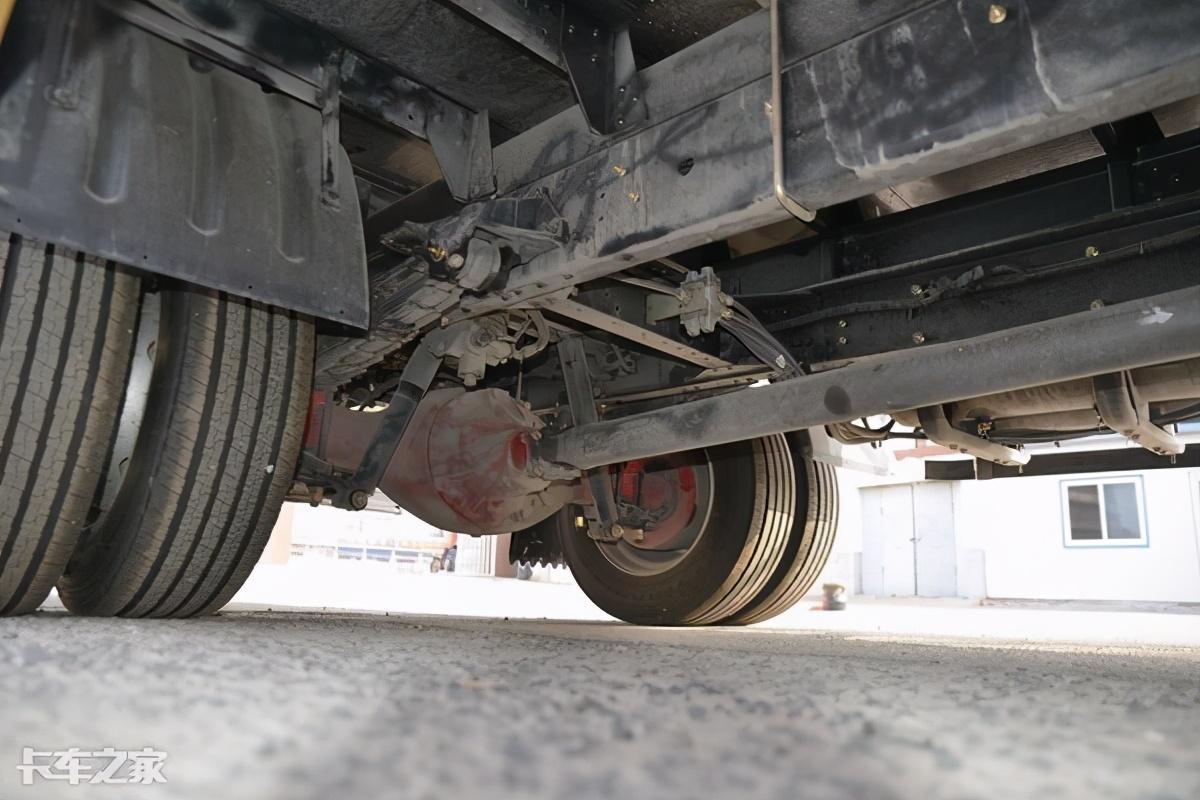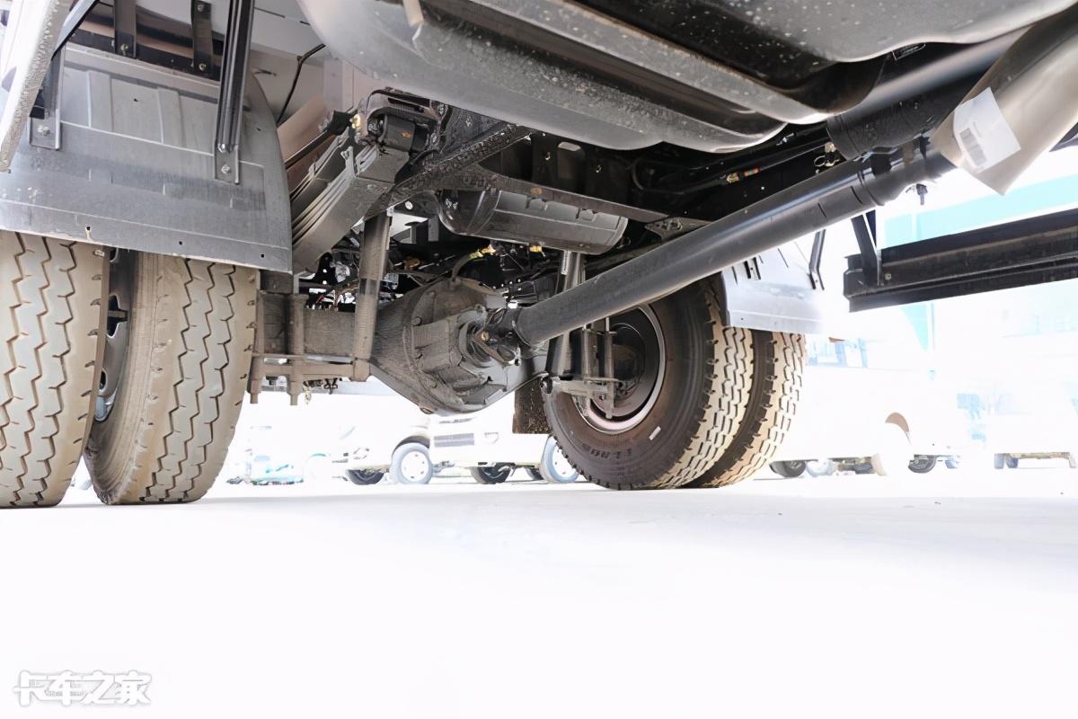 实拍车型底盘采用了前8后10+7的钢板弹簧结构,多片簧能够保证舒适的驾驶及出色承载能力。搭载德纳后桥,最大载荷达到7645kg,速比为4.33。搭载型号为TR685的三角轮胎,规格为245/70R19.5。可搭载尺寸为5150x2430x550mm货厢,装载能力相当出色。