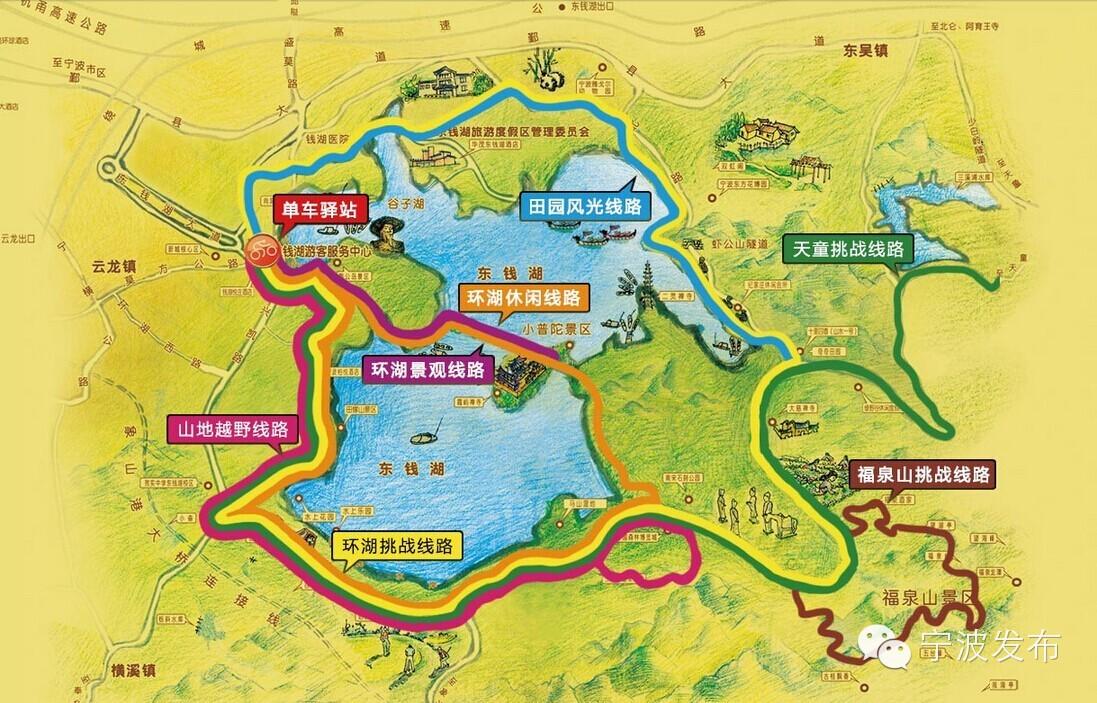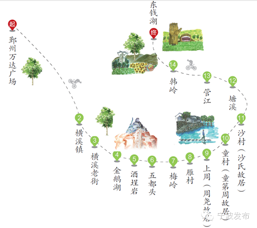 骑行路线: 鄞州万达广场→横溪镇→横溪老街→金鹅湖→酒埕岩→五都头→梅岭→雁村→上周(周尧故居)→童村(童第周故居)→沙村(沙氏故居)→塘溪→管江→韩岭→东钱湖