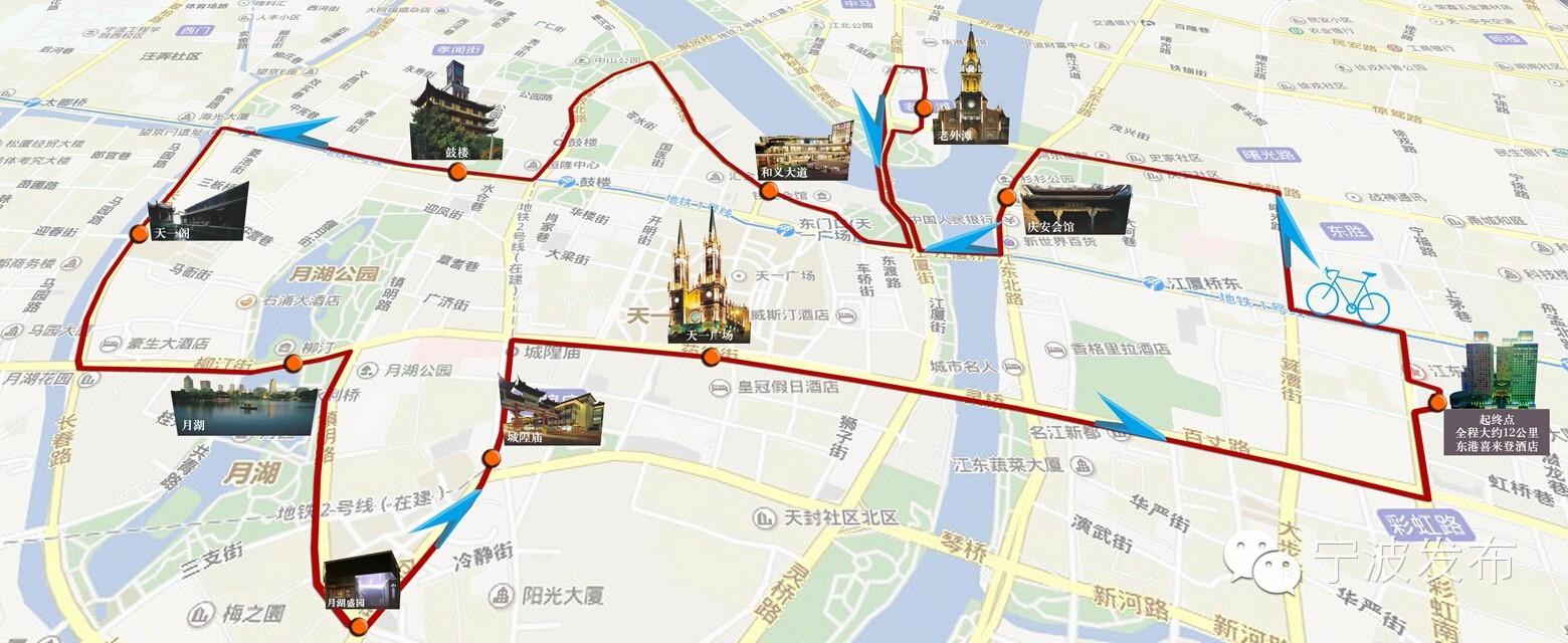 具体线路是: 东港喜来登酒店——庆安会馆——老外滩——和义大道——鼓楼——天一阁——月湖——月湖盛园——城隍庙——天一广场——东港喜来登酒店。