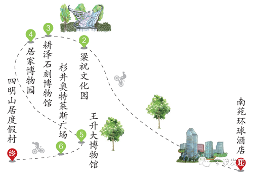 骑行路线: 南苑环球酒店→梁祝文化园→耕泽石刻博物馆→居家博物园→王升大博物馆→杉井奥特莱斯广场→四明山居度假村