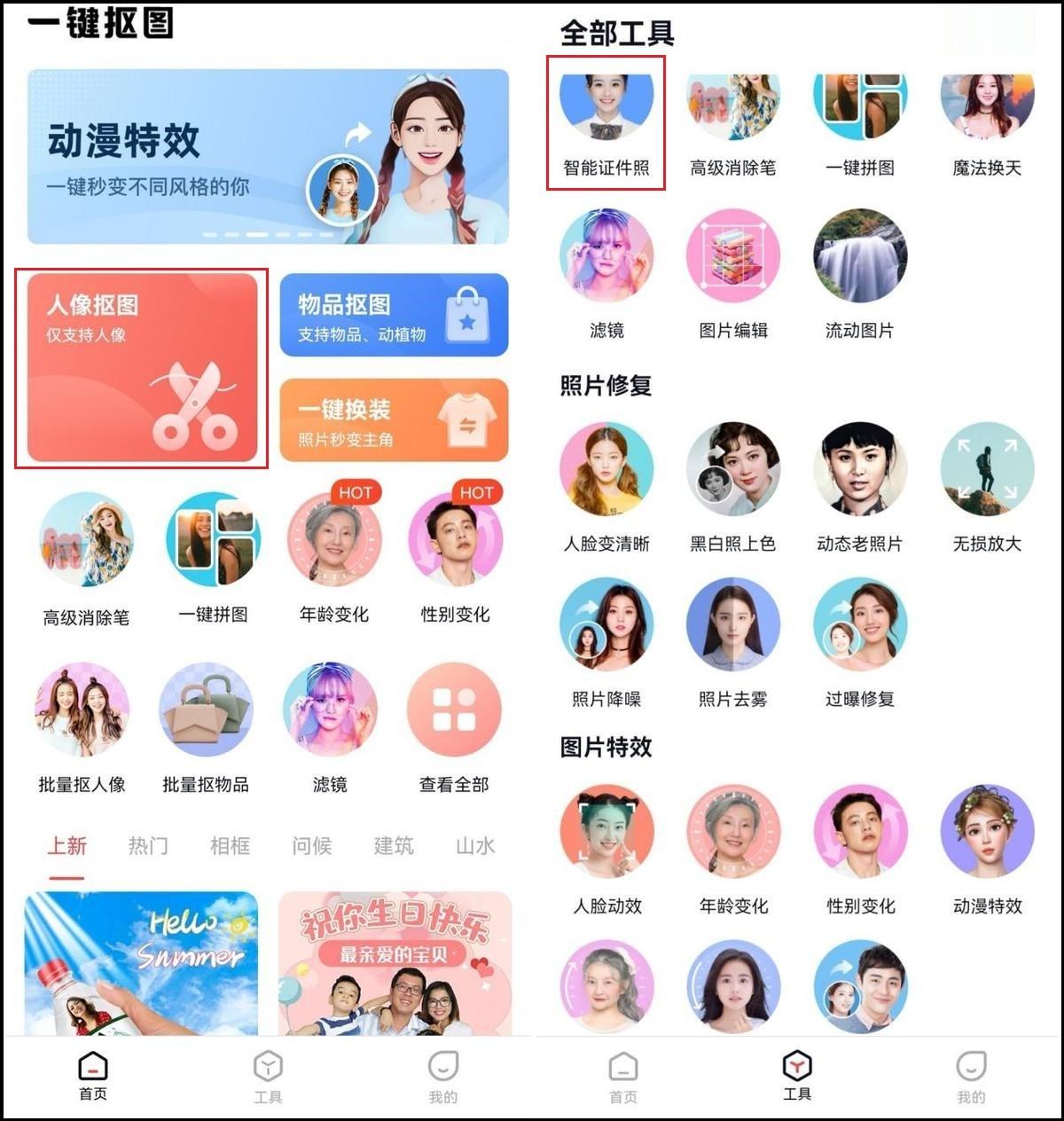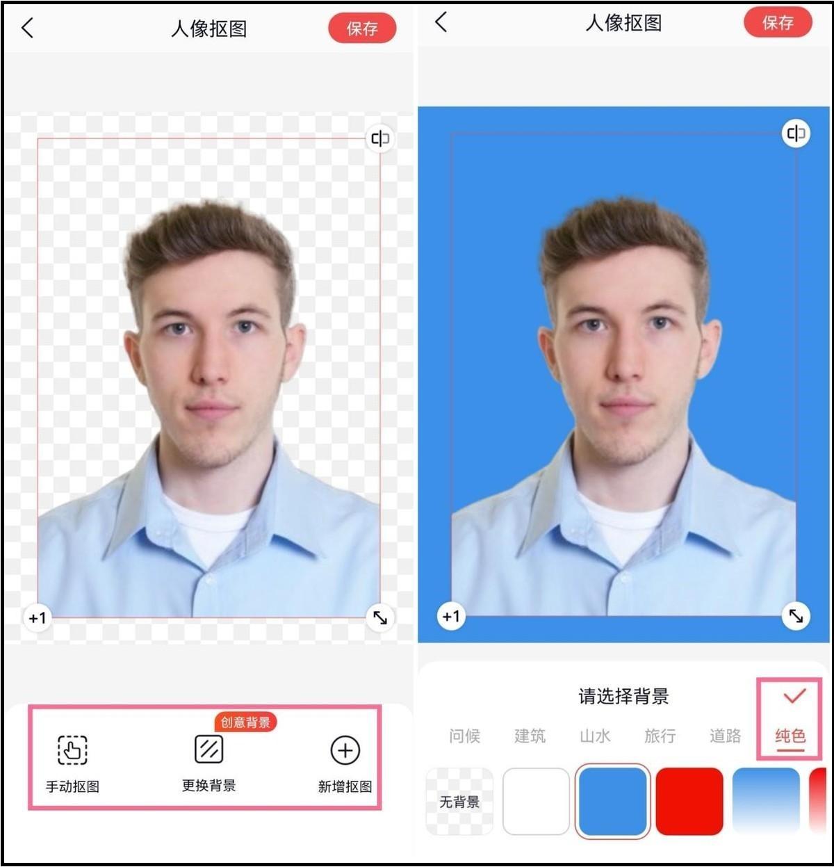 如果你已经有合适的正面照片,可以直接使用人像抠图功能,上传图片自动抠出人像。抠出肖像后,您可以更改背景颜色,软件会提供专业证件照的背景颜色。
