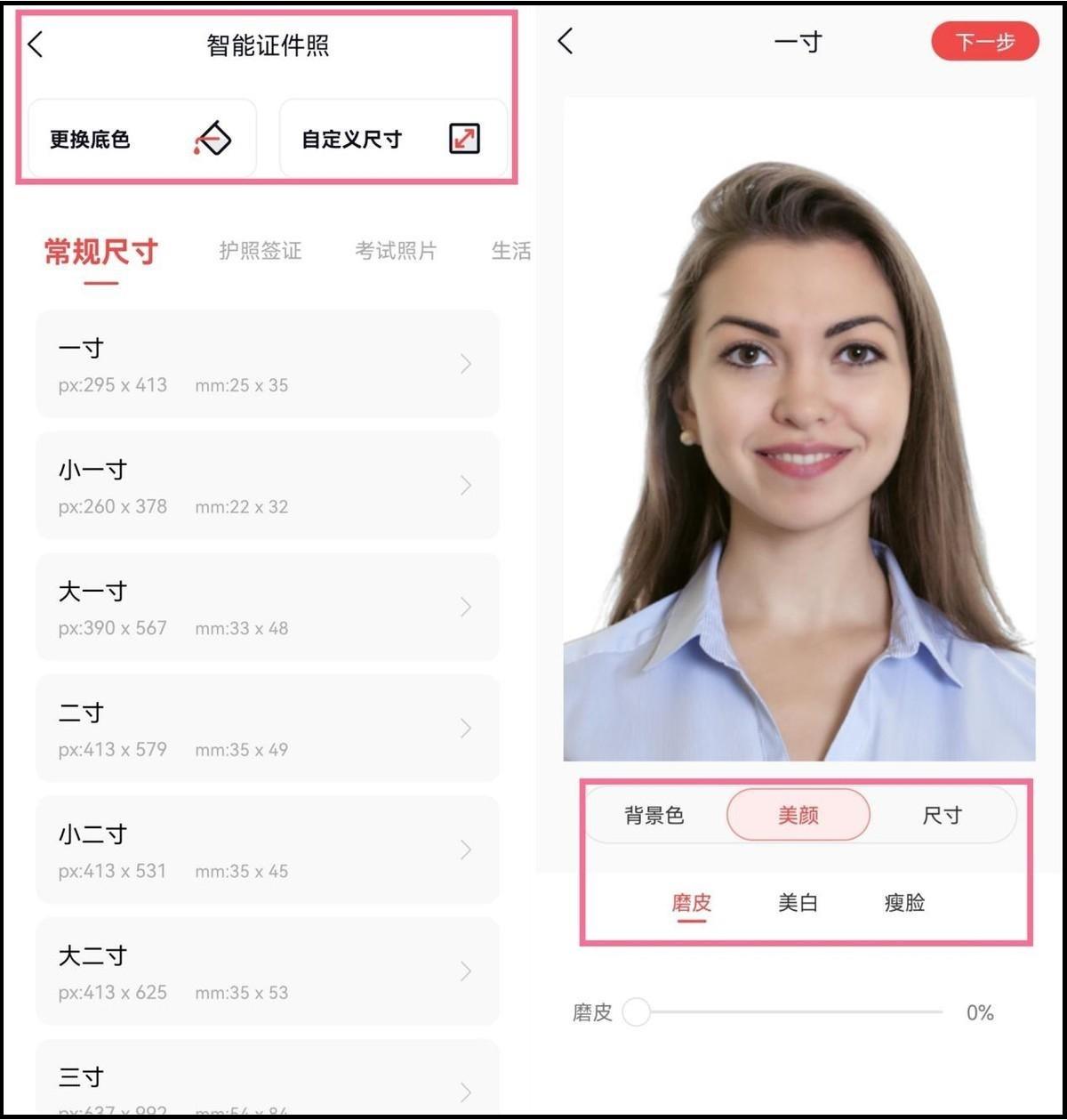 拍摄后,您可以设置背景颜色,或更改尺寸。不用担心不好看。软件自带磨皮,美白,瘦脸。