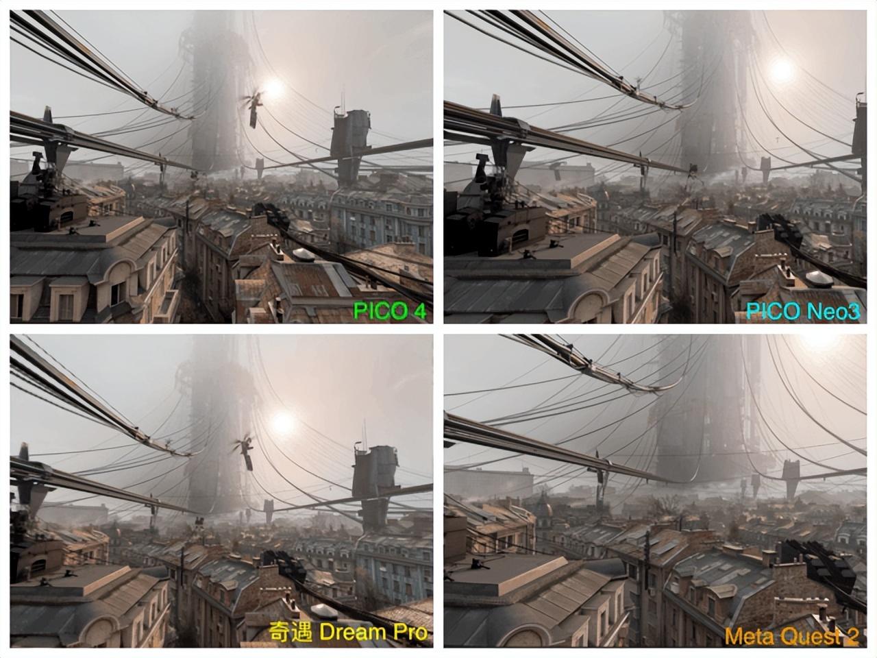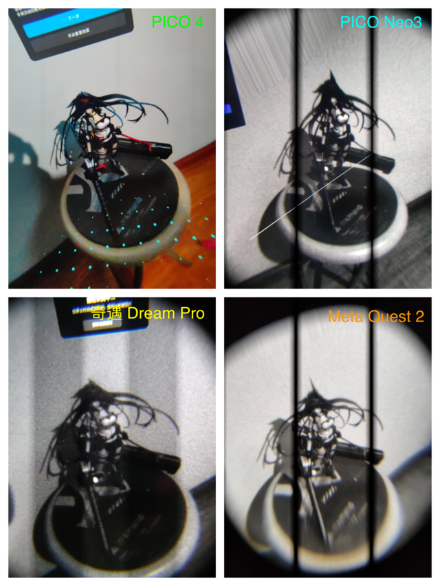 为了更加公平进行屏幕素质的评测,我使用了四款产品在同一场景分别进行了场景渲染与场景实拍的体验。首先从场景渲染的图片画面中,我们可以很明显看出 PICO 4的FOV(视场角)要比另外三款产品都要更大 ,从而让我们可以获得更宽广的视野范围。