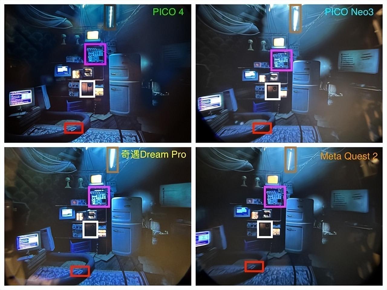 而在场景实拍的图片画面中,当我们仔细观察红框内的电线与白框内的木盒可以看出,PICO 4不仅对于光影的处理会更加细腻,对物品的细节相较于另外三款也会更清晰;而当我们聚焦于紫框内的元器件和棕框内对灯管可以很明显看出,PICO Neo3和奇遇Dream Pro对于这两个细节会产生光线过爆的情况,而Quest 2相较于PICO 4在亮部细节的优化上会更胜一筹。综合来看, PICO 4相较于另外三款产品而言,在整体细节处理上会更好,并且“甜蜜点”的清晰度区域也更大一些 。