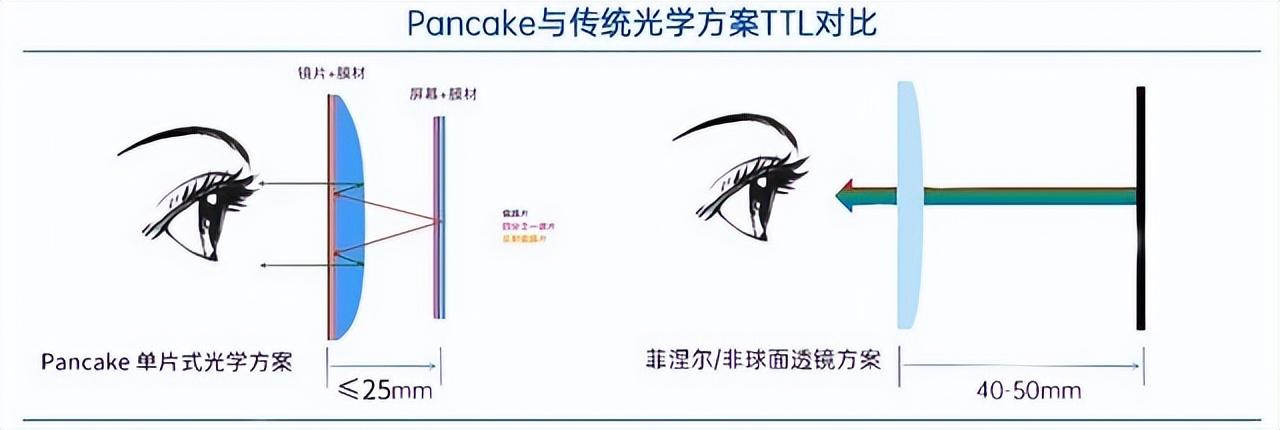 另外,决定一款VR一体机重量还取决于其采用的是何种光学透镜方案。从关键硬件参数图中,我们可以发现, 4款主流VR一体机采用了3种不同的光学透镜方案,而这也代表着整个行业发展的三个阶段 。PICO Neo3与Quest 2均采用了 目前主流的菲涅尔光学透镜方案 ,类似于凸透镜的成像原理, 需要在屏幕和透镜中间留出较大的光路距离 ,这样会导致VR头显的体积相对较厚,同时还会出现画面畸变、边缘模糊等问题,较大程度影响用户的实际佩戴体感。