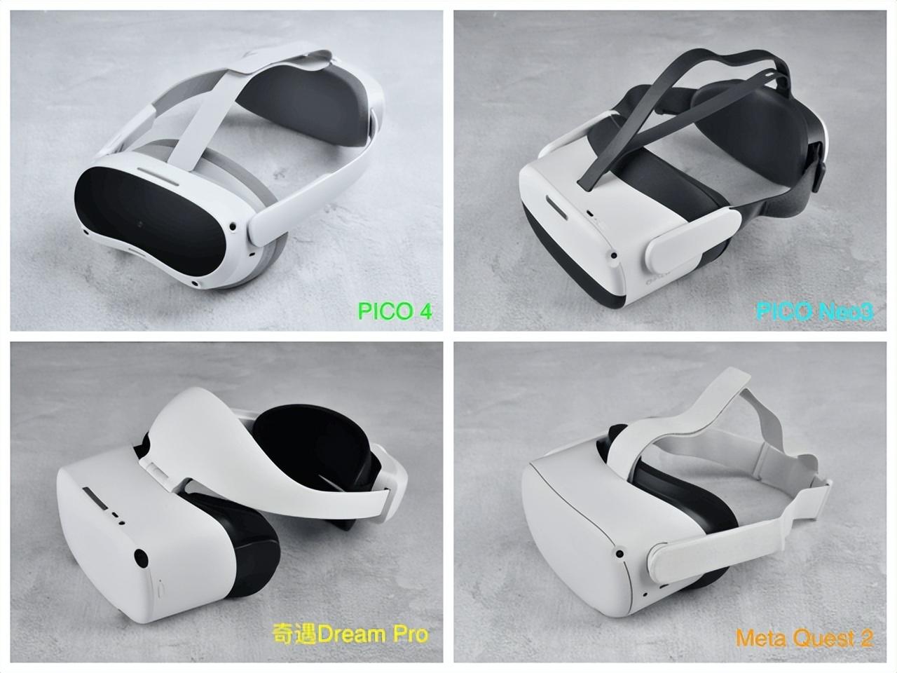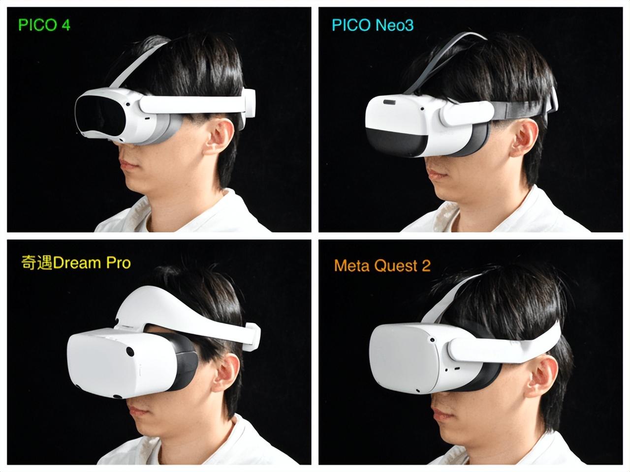 首先对于一款长时间佩戴的科技产品而言,佩戴舒适度一定是重中之重。从上图中我们可以看到,四款产品在重量及前后重量的分布存在差异。通过我对它们进行的重量实测,Quest 2整机重量(524g)是四款产品中最轻的,接下来依次是PICO 4(581g)、PICO Neo3(625g)、奇遇Dream Pro(692g)。
