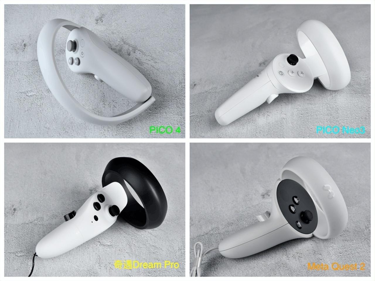说完了四款产品的主机,接下来让我们将目光聚焦于它们搭配的手柄上。从下图我们可以看到,PICO Neo3、奇遇Dream Pro、Quest 2三款产品的手柄均“默契”得采用了顶部圆环的设计,但是 这样的设计会让用户在使用(尤其是娱乐场景)中发生碰撞 。