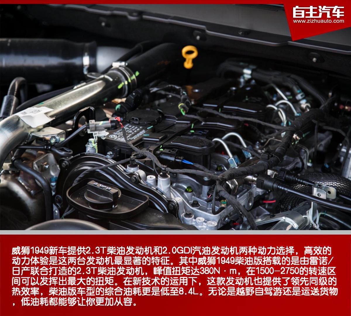 威狮1949新车提供2.3T柴油发动机和2.0GDI汽油发动机两种动力选择,高效的动力体验是这两台发动机最显著的特征。其中威狮1949柴油版搭载的是由雷诺/日产联合打造的2.3T柴油发动机,峰值扭矩达380N·m,在1500-2750的转速区间可以发挥出最大的扭矩。在新技术的运用下,这款发动机也提供了领先同级的热效率,柴油版车型的综合油耗更是低至8.4L。无论是越野自驾游还是运送货物,低油耗都能够让你更加从容。