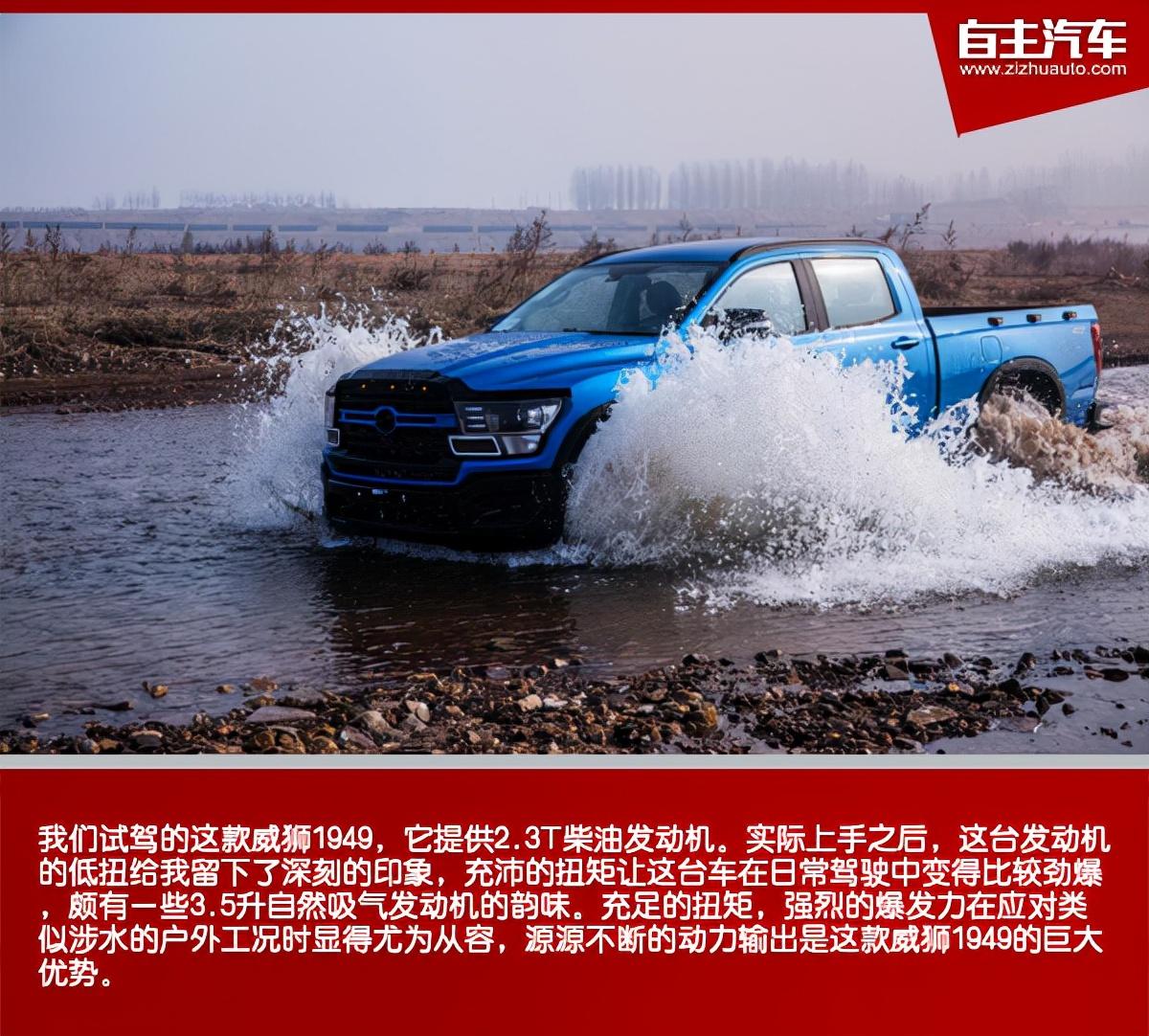 我们试驾的这款威狮1949,它提供2.3T柴油发动机。实际上手之后,这台发动机的低扭给我留下了深刻的印象,充沛的扭矩让这台车在日常驾驶中变得比较劲爆,颇有一些3.5升自然吸气发动机的韵味。充足的扭矩,强烈的爆发力在应对类似涉水的户外工况时显得尤为从容,源源不断的动力输出是这款威狮1949的巨大优势。