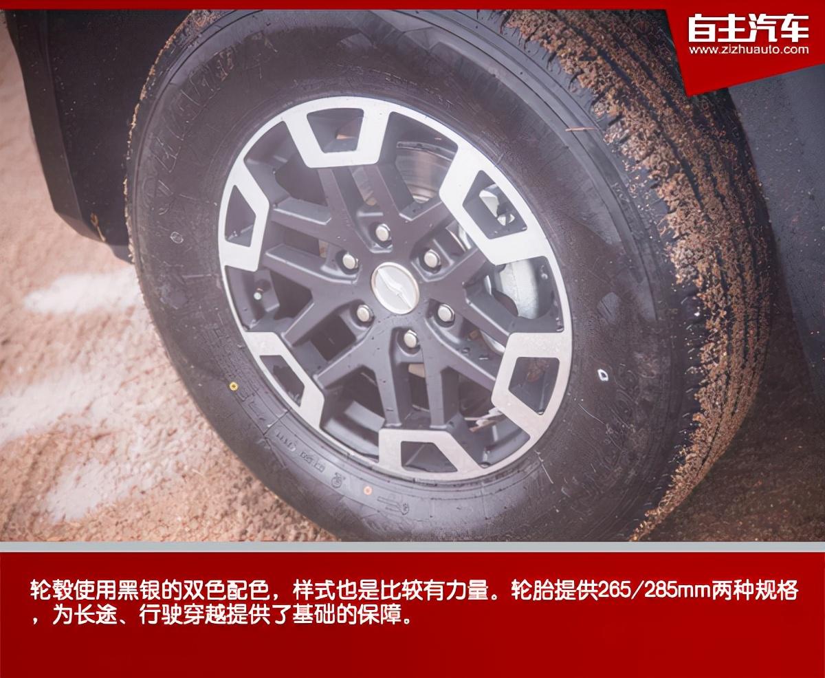 轮毂使用黑银的双色配色,样式也是比较有力量。轮胎提供265/285mm两种规格,为长途、行驶穿越提供了基础的保障。