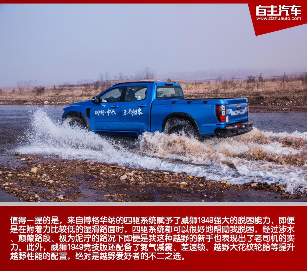 值得一提的是,来自博格华纳的四驱系统赋予了威狮1949强大的脱困能力,即便是在附着力比较低的湿滑路面时,四驱系统都可以很好地帮助我脱困,经过涉水、颠簸路段、极为泥泞的路况下即便是我这种越野的新手也表现出了老司机的实力。此外,威狮1949竞技版还配备了氮气减震、差速锁、越野大花纹轮胎等提升越野性能的配置,绝对是越野爱好者的不二之选。