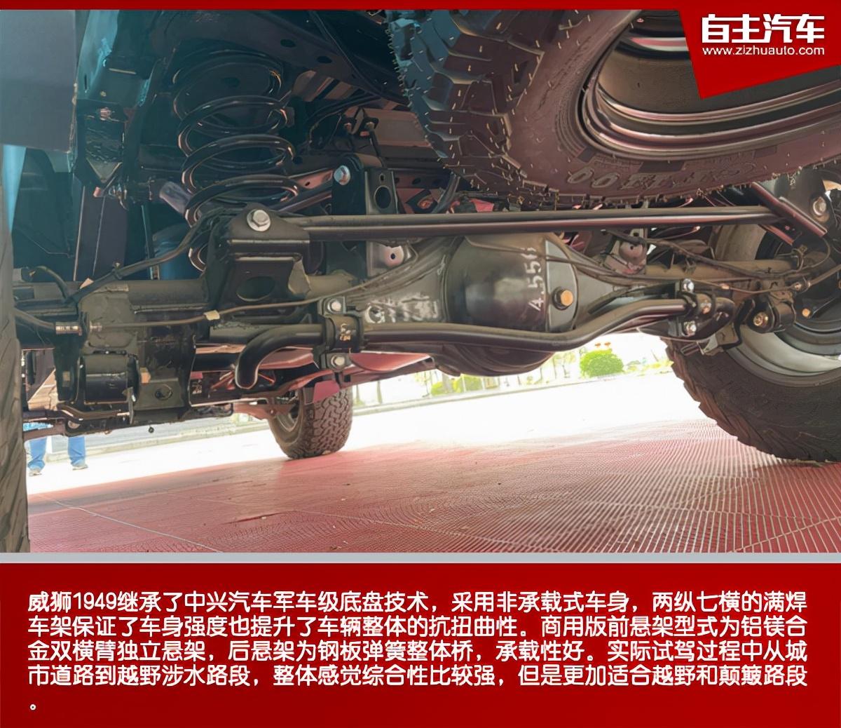 威狮1949继承了中兴汽车军车级底盘技术,采用非承载式车身,两纵七横的满焊车架保证了车身强度也提升了车辆整体的抗扭曲性。商用版前悬架型式为铝镁合金双横臂独立悬架,后悬架为钢板弹簧整体桥,承载性好。实际试驾过程中从城市道路到越野涉水路段,整体感觉综合性比较强,但是更加适合越野和颠簸路段。