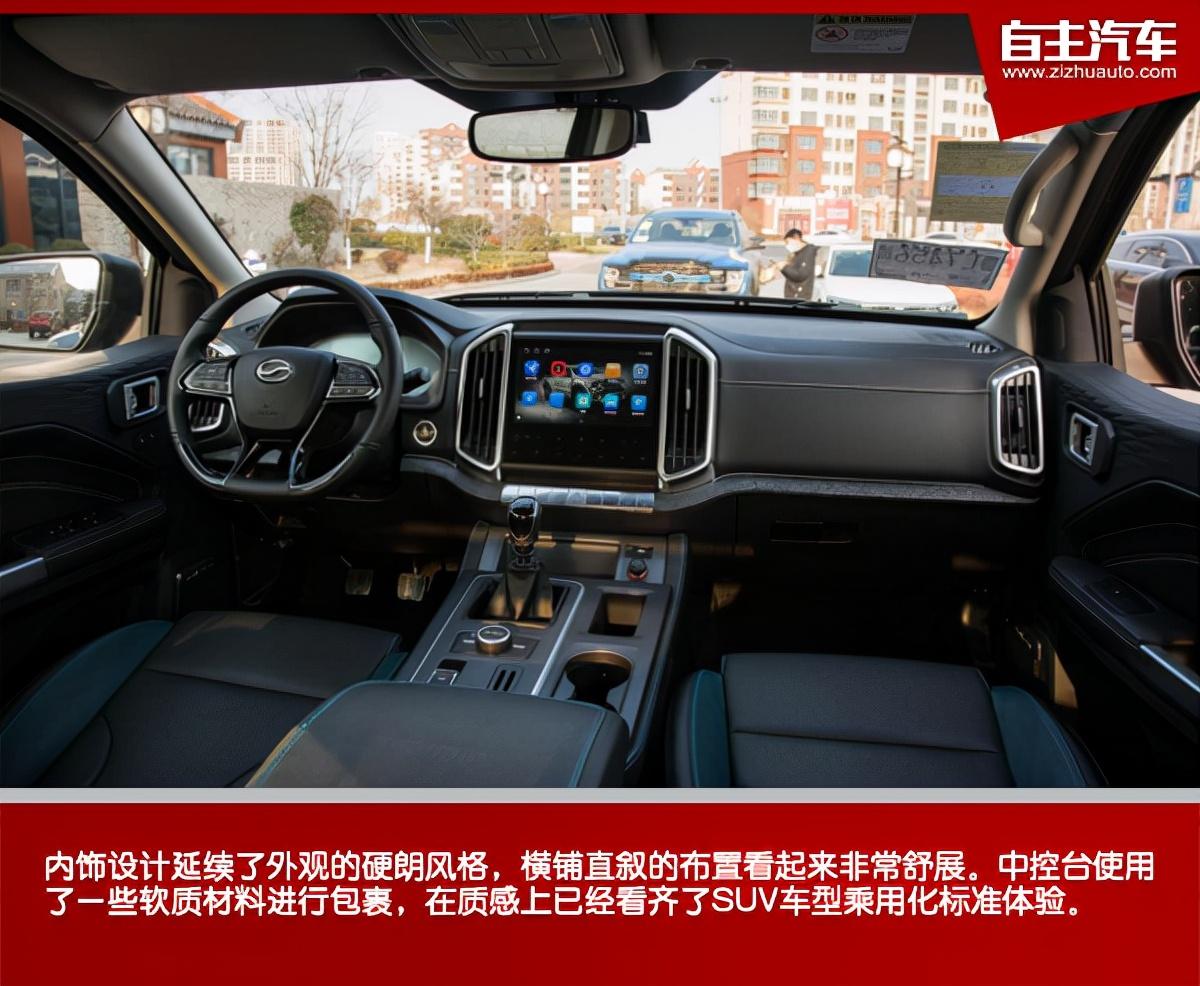 内饰设计延续了外观的硬朗风格,横铺直叙的布置看起来非常舒展。中控台使用了一些软质材料进行包裹,在质感上已经看齐了SUV车型乘用化标准体验。
