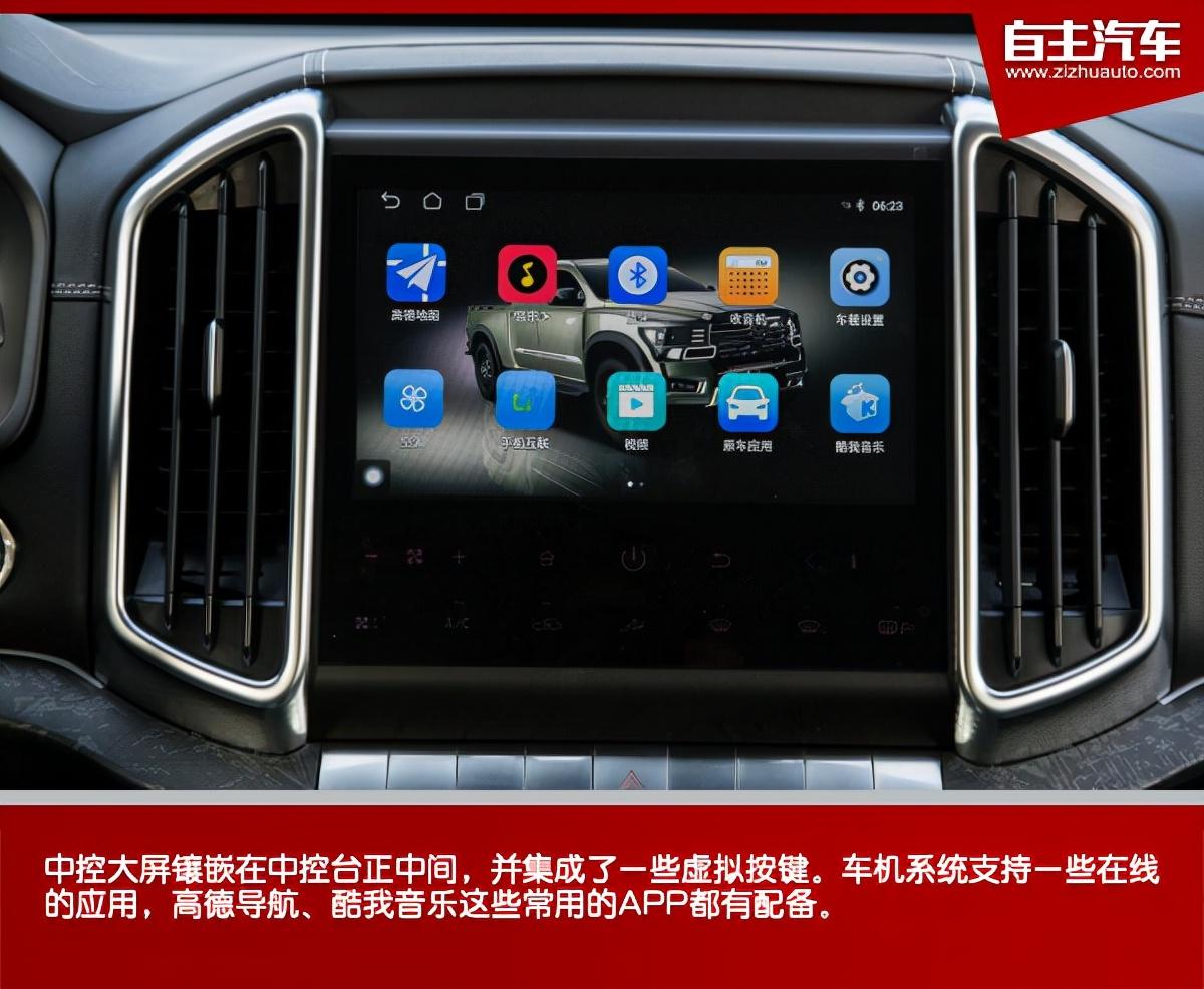 中控大屏镶嵌在中控台正中间,并集成了一些虚拟按键。车机系统支持一些在线的应用,高德导航、酷我音乐这些常用的APP都有配备。