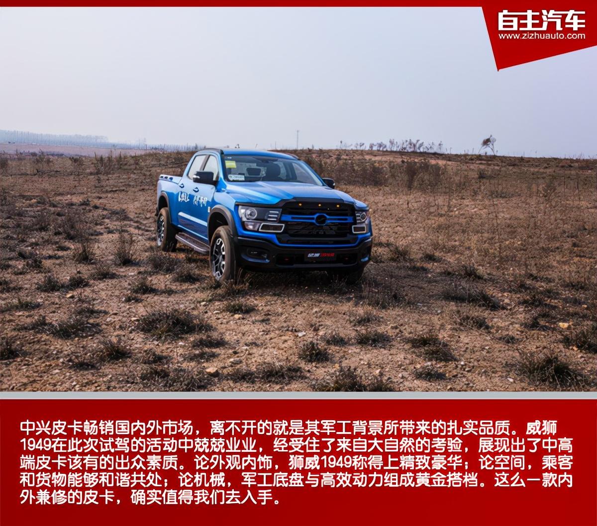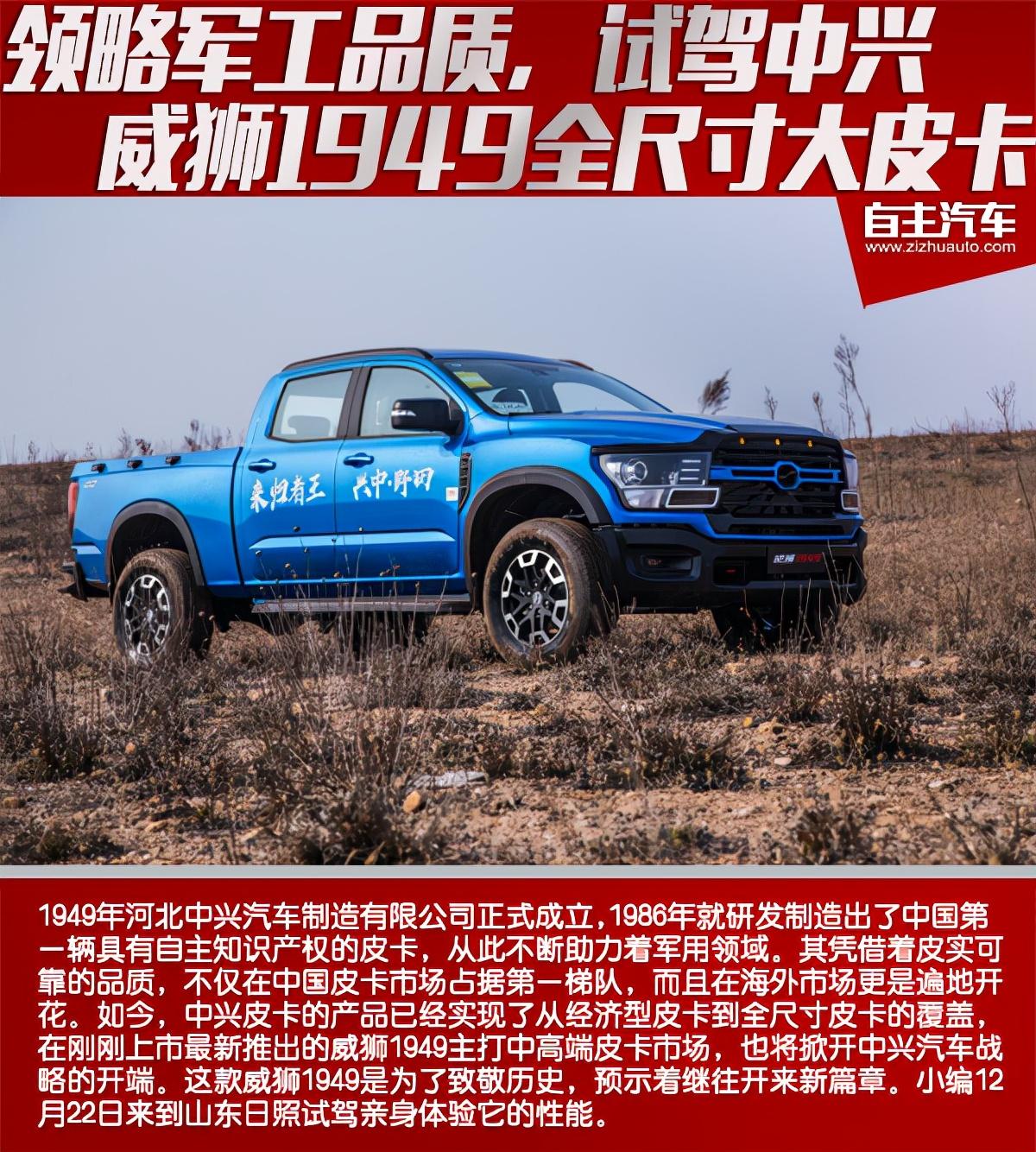 1949年河北中兴汽车制造有限公司正式成立,1986年就研发制造出了中国第一辆具有自主知识产权的皮卡,从此不断助力着军用领域。其凭借着皮实可靠的品质,不仅在中国皮卡市场占据第一梯队,而且在海外市场更是遍地开花。如今,中兴皮卡的产品已经实现了从经济型皮卡到全尺寸皮卡的覆盖,在刚刚上市最新推出的威狮1949主打中高端皮卡市场,也将掀开中兴汽车战略的开端。这款威狮1949是为了致敬历史,预示着继往开来新篇章。小编12月22日来到山东日照试驾亲身体验它的性能。