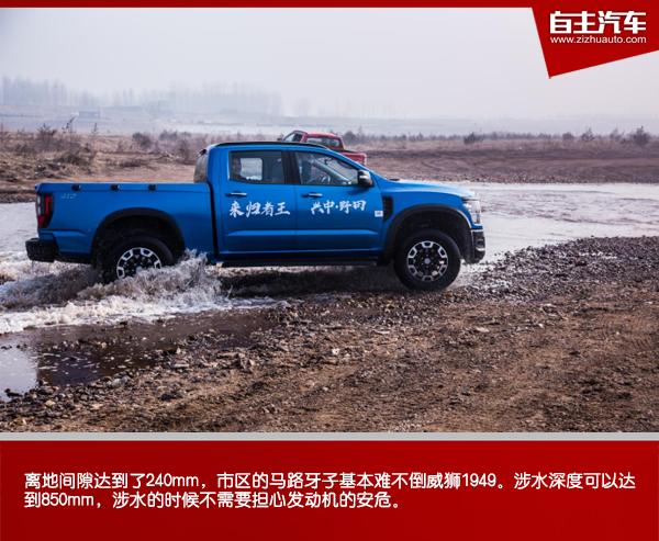 离地间隙达到了240mm,市区的马路牙子基本难不倒威狮1949。涉水深度可以达到850mm,涉水的时候不需要担心发动机的安危。