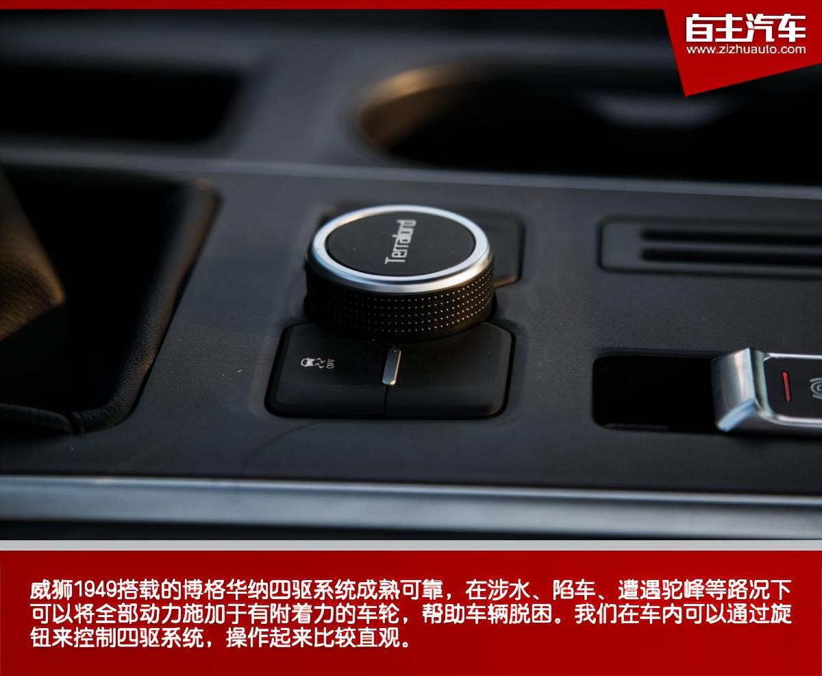 威狮1949搭载的博格华纳四驱系统成熟可靠,在涉水、陷车、遭遇驼峰等路况下可以将全部动力施加于有附着力的车轮,帮助车辆脱困。我们在车内可以通过旋钮来控制四驱系统,操作起来比较直观。
