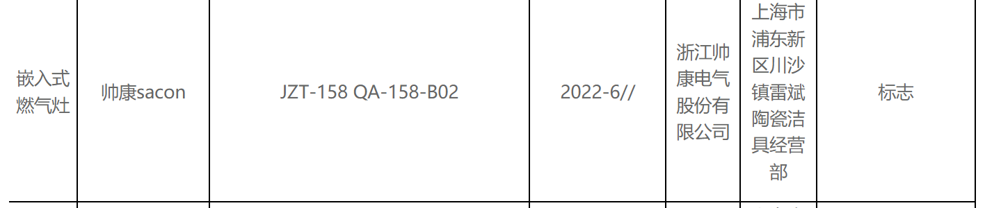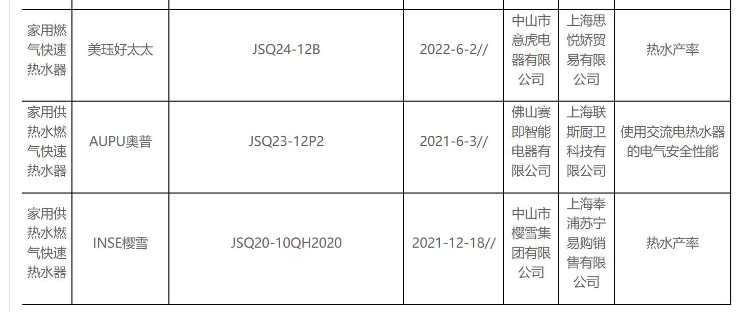 不合格名单显示,浙江帅康电气股份有限公司生产的帅康sacon牌嵌入式燃气灶(规格型号JZT-158 QA-158-B02;生产日期/批号JZT-158 QA-158-B02),标志项目不合格;中山市意虎电器有限公司生产的美珏好太太牌家用燃气快速热水器(规格型号JSQ24-12B;生产日期/批号2022-6-2//),热水产率不合格;佛山赛即智能电器有限公司生产的AUPU奥普牌家用供热水燃气快速热水器(规格型号JSQ23-12P2;生产日期/批号2021-6-3//),使用交流电热水器的电气安全性能不合格;中山市樱雪集团有限公司生产的INSE樱雪牌家用供热水燃气快速热水器(规格型号JSQ20-10QH2020;生产日期/批号2021-12-18//),热水产率不合格。