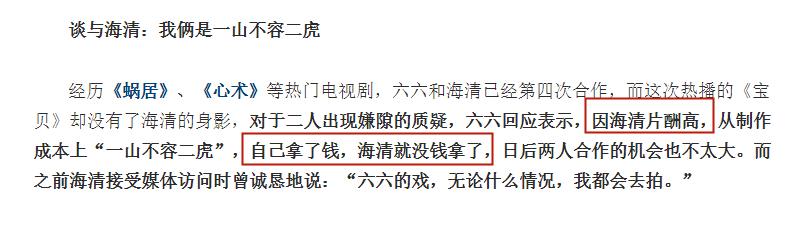 对此,六六表示是因为海清太“贵”了,两人合作一个拿了钱,另一个就没钱拿了。