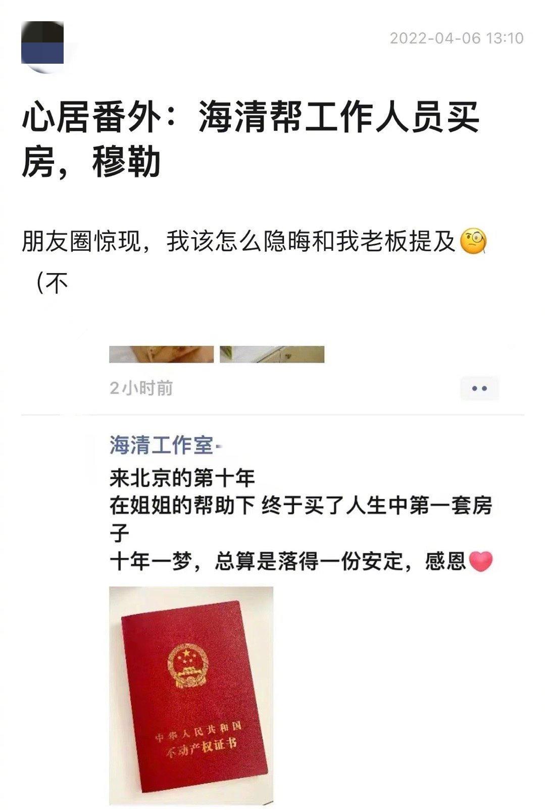 就在前几天,海清工作室的员工在朋友圈晒了一张房产证,还特别强调“在姐姐的帮助下,终于买了人生中第一套房”,言语之间满是感激。