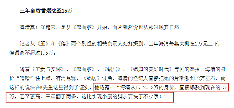 按原先的一集电视剧15万计算,这一年海清轻轻松松就赚了大约840万。