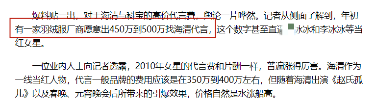 代言费这个东西就跟片酬一样,一年一个价,不断地涨。2011年的时候,就有媒体爆料海清的代言费高达500万。