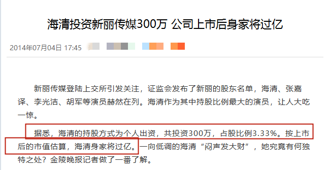 早年间她就拿出300万投资了新丽传媒,后来公司成功上市,她直接“闷声发大财”,在2014年就身家过亿。