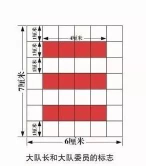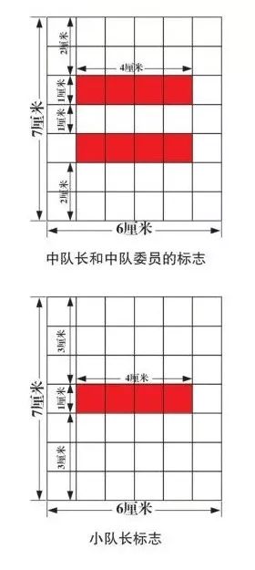 队委(队长)标志由白底、红杠组成,白底高7厘米、宽6厘米,红杠长4厘米、宽1厘米。大队委标志中间为三条红杠,中队委标志中间为两条红杠,小队长标志中间为一条红杠。红杠之间间隔1厘米,与白底左右边缘各相距1厘米。大队委标志上下各空1厘米,中队委标志上下各空2厘米,小队长标志上下各空3厘米。