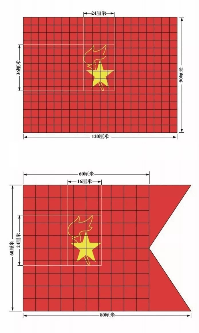 中队旗长80厘米、高60厘米。右端剪去高20厘米、底宽60厘米的等腰三角形,形成一个三角形缺口,五角星及火炬在以60厘米为边长的正方形中心。