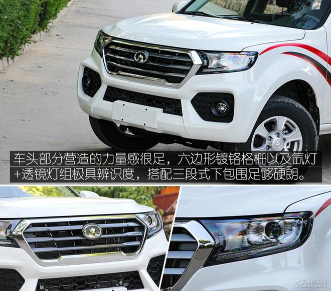 外观方面,风骏7在整体造型上还是延续了长城皮卡风骏系列阳刚的设计理念,给人直观印象充满了力量感,并且在细节部分也体现出了家族式风格,六边形镀铬材质的进气格栅与大灯组成一体式布局,经典元素的保留让人即便离的很远都可以认出它就是一款长城车型。