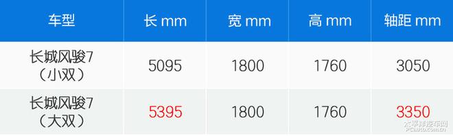 风骏7提供了大双排与小双排两个版本可选,这也与大多数皮卡分类一样,车身尺寸上,小双排车身尺寸为:5095*1800*1760mm,轴距为3050mm。货箱尺寸为1380*1460*480mm。而大双排车型尺寸高度与宽度保持不变,只是长度达到了5395mm,并且轴距也有300mm的增加,货箱长度也同时增加了300mm,达到了1680mm。