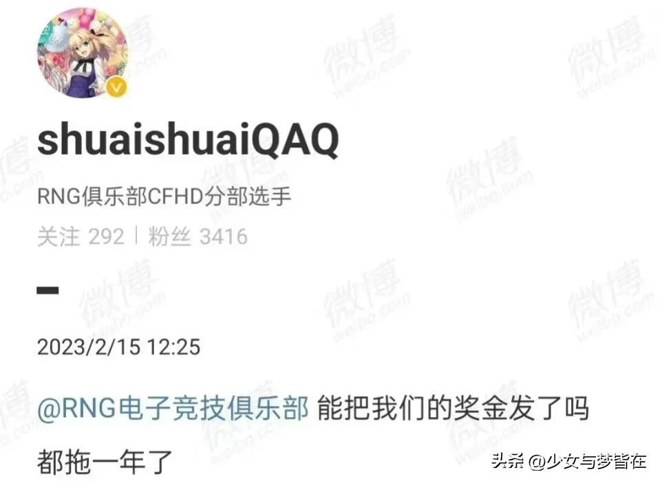 事情是这样子的,15日中午12时,前RNG.CFHD分部选手shuaishuai发文:“能把自己的奖金发了吗?拖了一年了!”