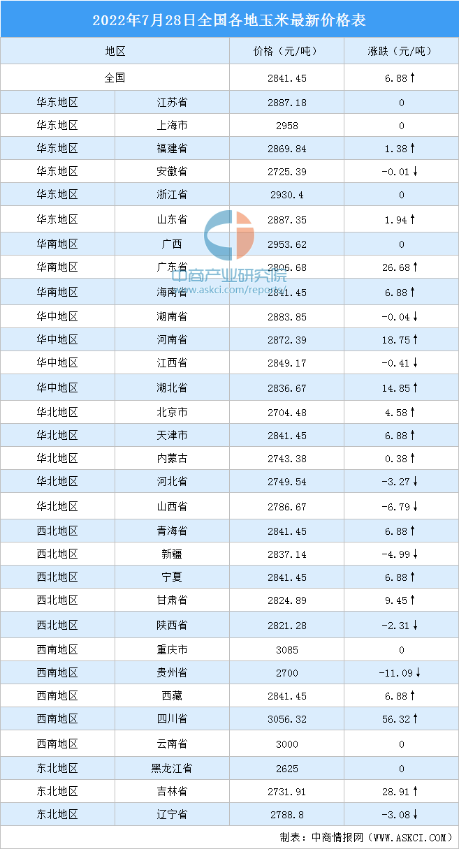 中商情报网讯:2022年7月28日全国玉米价格有所上涨,从地区上看有涨有跌。7月28日全国玉米均价为2841.45元/吨,环比每吨上涨6.88元。重庆市玉米均价最高为3085元/