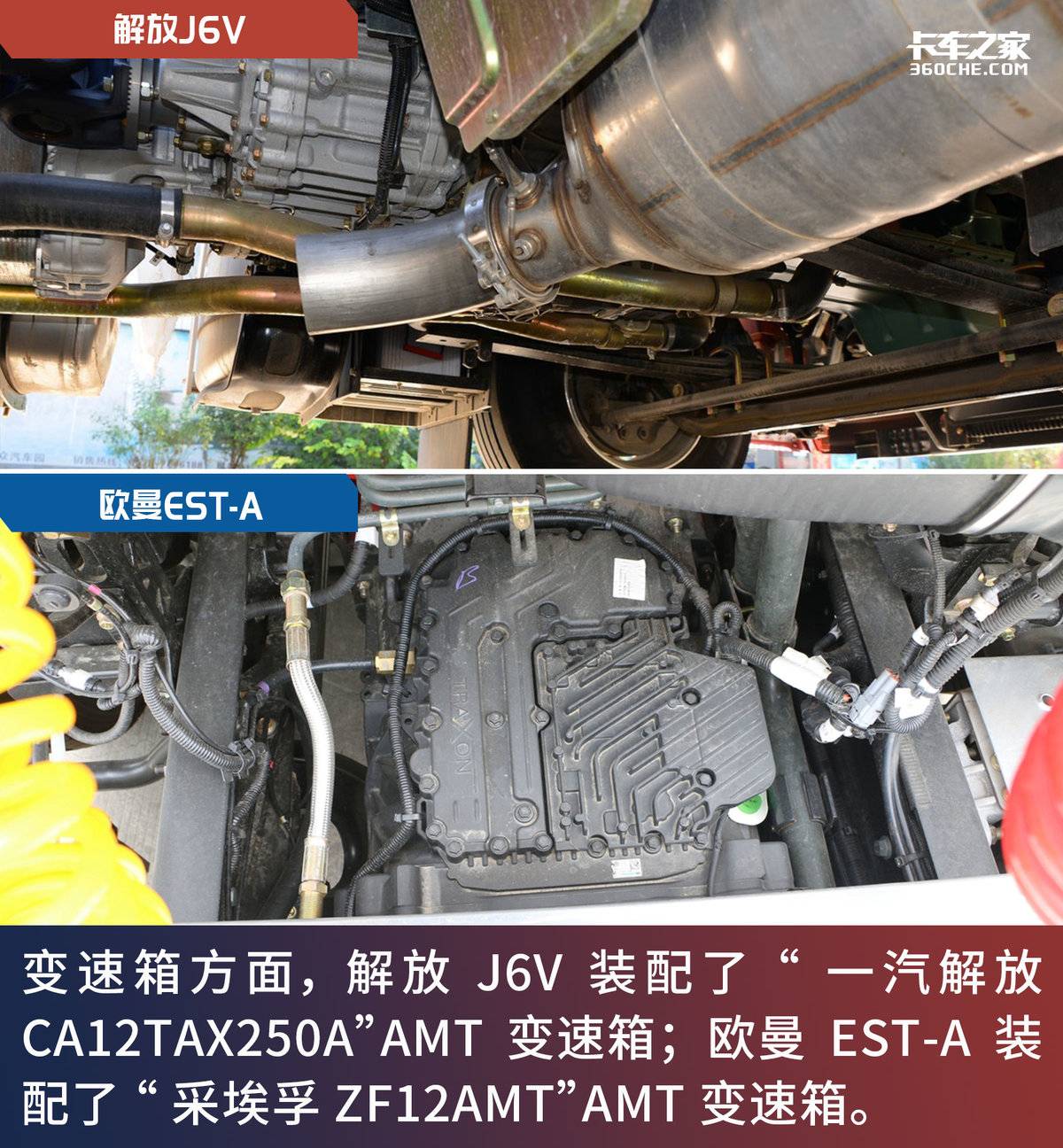 两车都装配了12档的AMT手自一体变速箱。解放J6P的“一汽解放CA12TAX250A”是在现有12挡铝壳体带缓速器机械式变速器基础上增加了AMT系统,换挡执行器为电动控制,离合器执行器为气动控制;除具有12挡双中间轴共性优点外,主箱增加了制动器装置,使换挡更迅速。