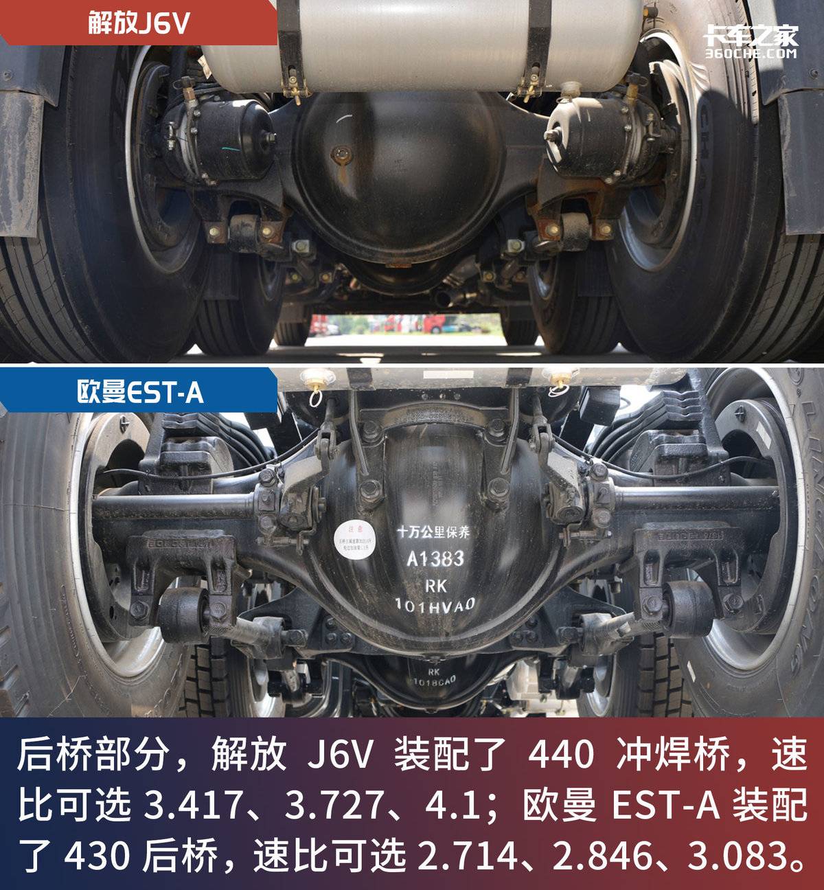 由于两车变速箱传动比的不同,所以它们后桥速比的范围也有较大差异。解放J6V选择了“超速挡+较大速比”配置,欧曼EST-A则选择了“直接挡+较小速比”配置;不过两车可选择的后桥速比范围都十分宽泛,可以说覆盖了“干线物流”“零担物流”“散杂普货”“绿通运输”和“资源运输”等场景。